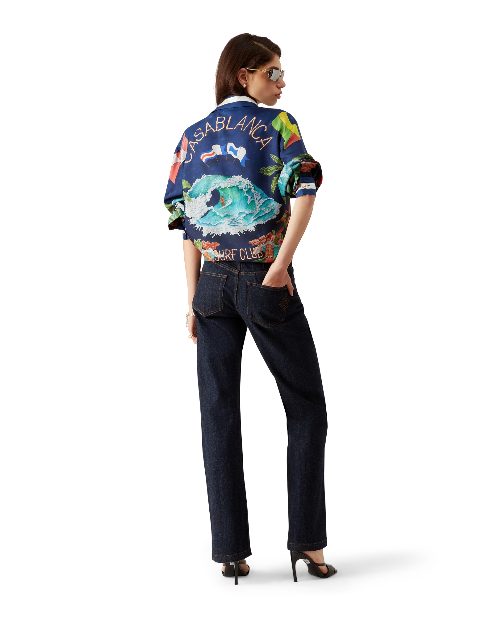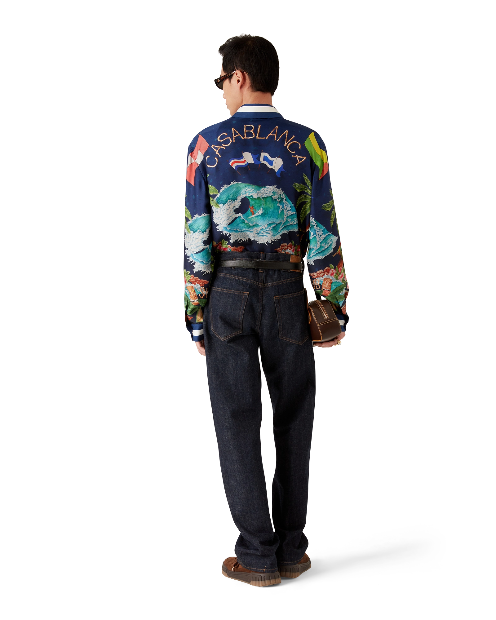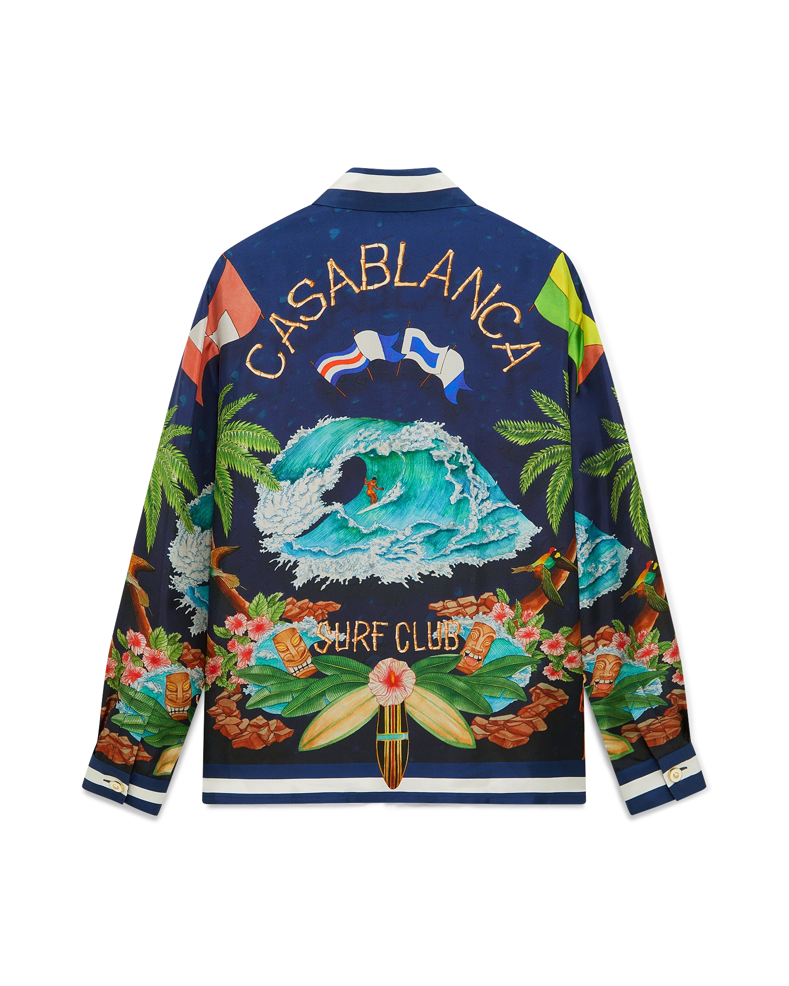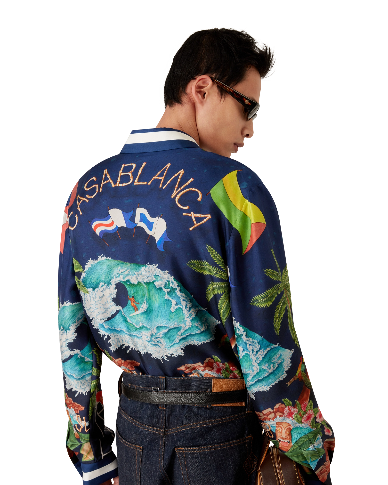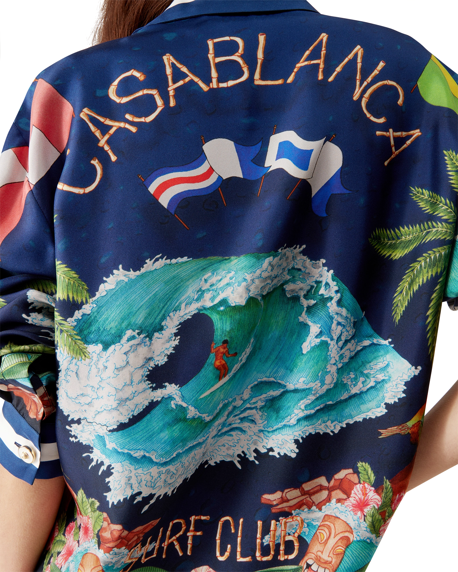 The Casablanca Surf Club silk long-sleeve shirt is an all-over printed design featuring artwork reinterpreting the house’s Tennis Club print in a surf theme, in the style of a graphic sketch drawn with markers, crafted from silk twill fabric. Finished with a Cuban collar, a breast pocket, hidden button closure with interlocking CC logo corozo buttons, and a gold rim enamel button on each cuff.