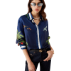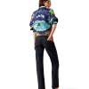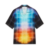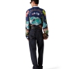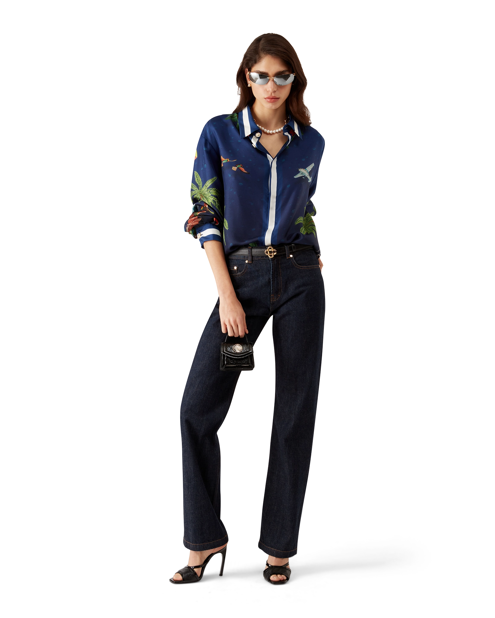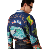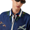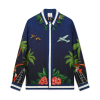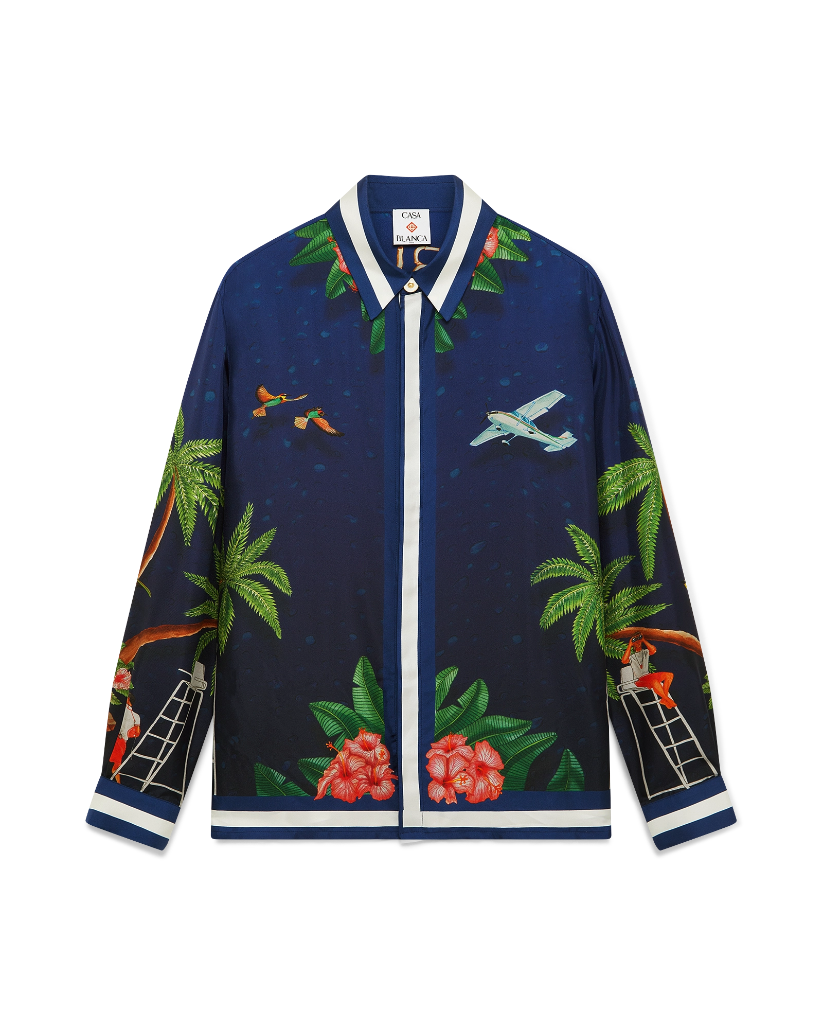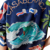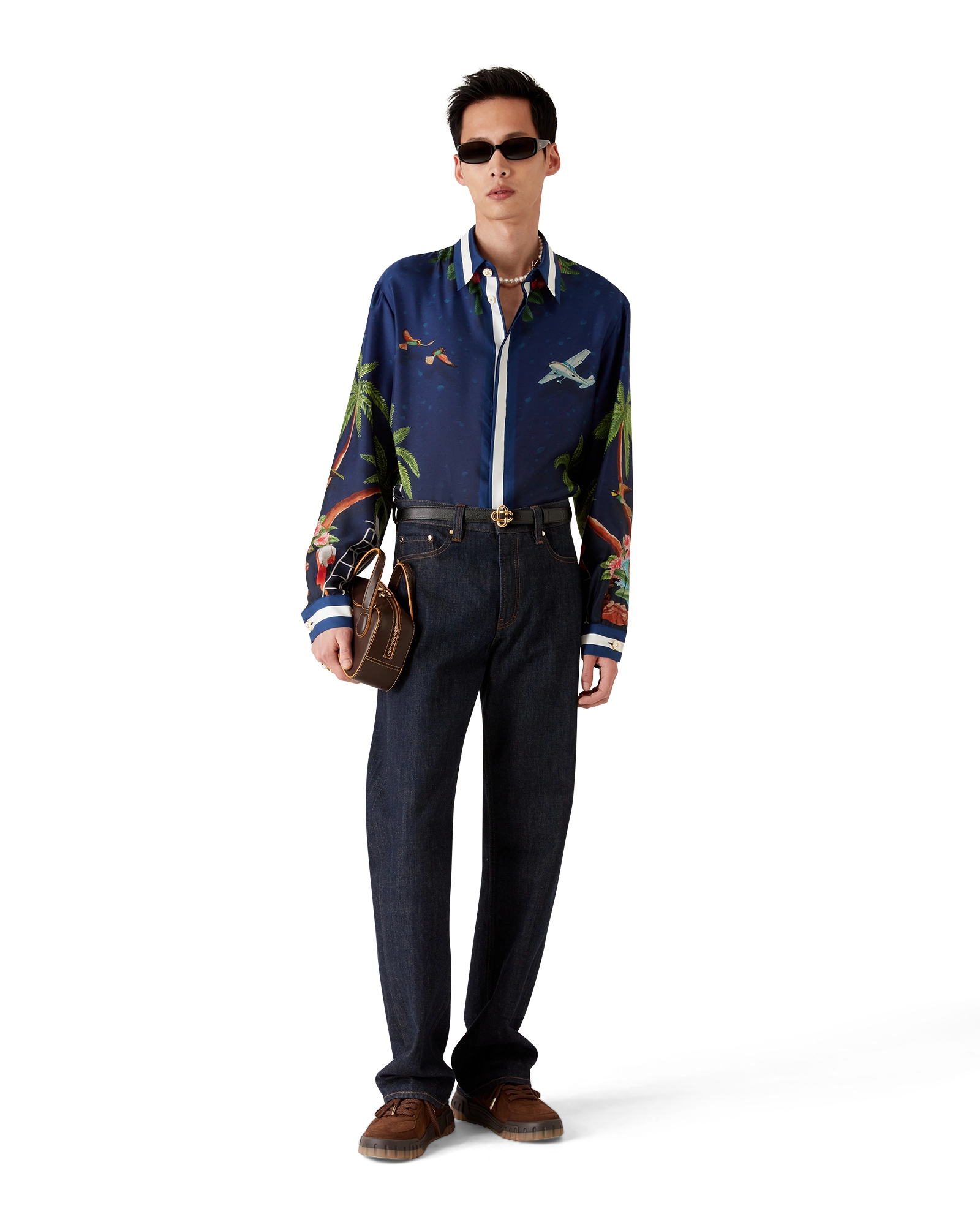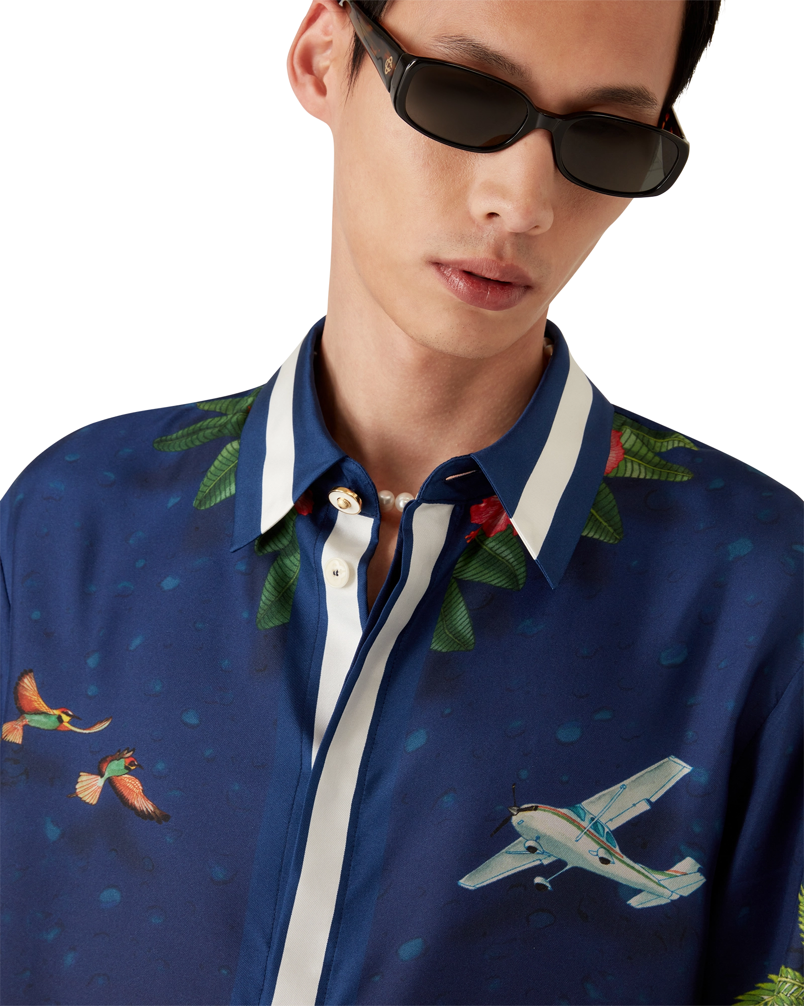 The Casablanca Surf Club silk long-sleeve shirt is an all-over printed design featuring artwork reinterpreting the house’s Tennis Club print in a surf theme, in the style of a graphic sketch drawn with markers, crafted from silk twill fabric. Finished with a Cuban collar, a breast pocket, hidden button closure with interlocking CC logo corozo buttons, and a gold rim enamel button on each cuff.