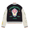 The chenille patchwork bomber jacket is a traditional bomber-style jacket featuring iconographies used throughout previous collections, crafted from virgin wool and leather with Greek letter embroidery featuring ancient Greek influence intertwined with futuristic elements and the house’s signature design elements such as the Laurel leaf artwork, a tennis racket and ball, and oranges, and a torch. Completed with seasonal motifs of ancient Greece, pocket openings created by a curved Ionic column, button closure with gold-plated branded hardware, a rib stand up collar, cuffs and hem with multicolour stripe detail.
