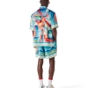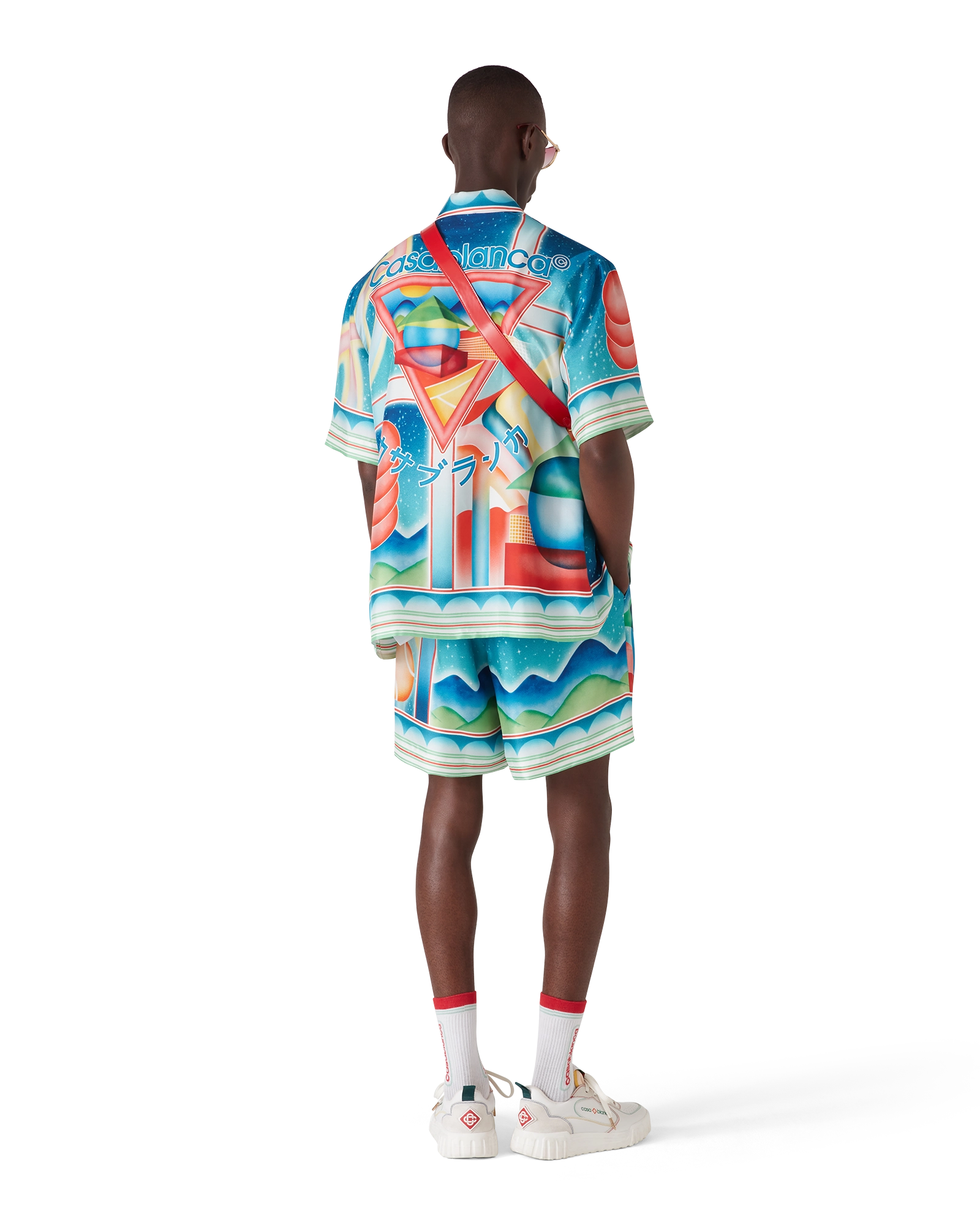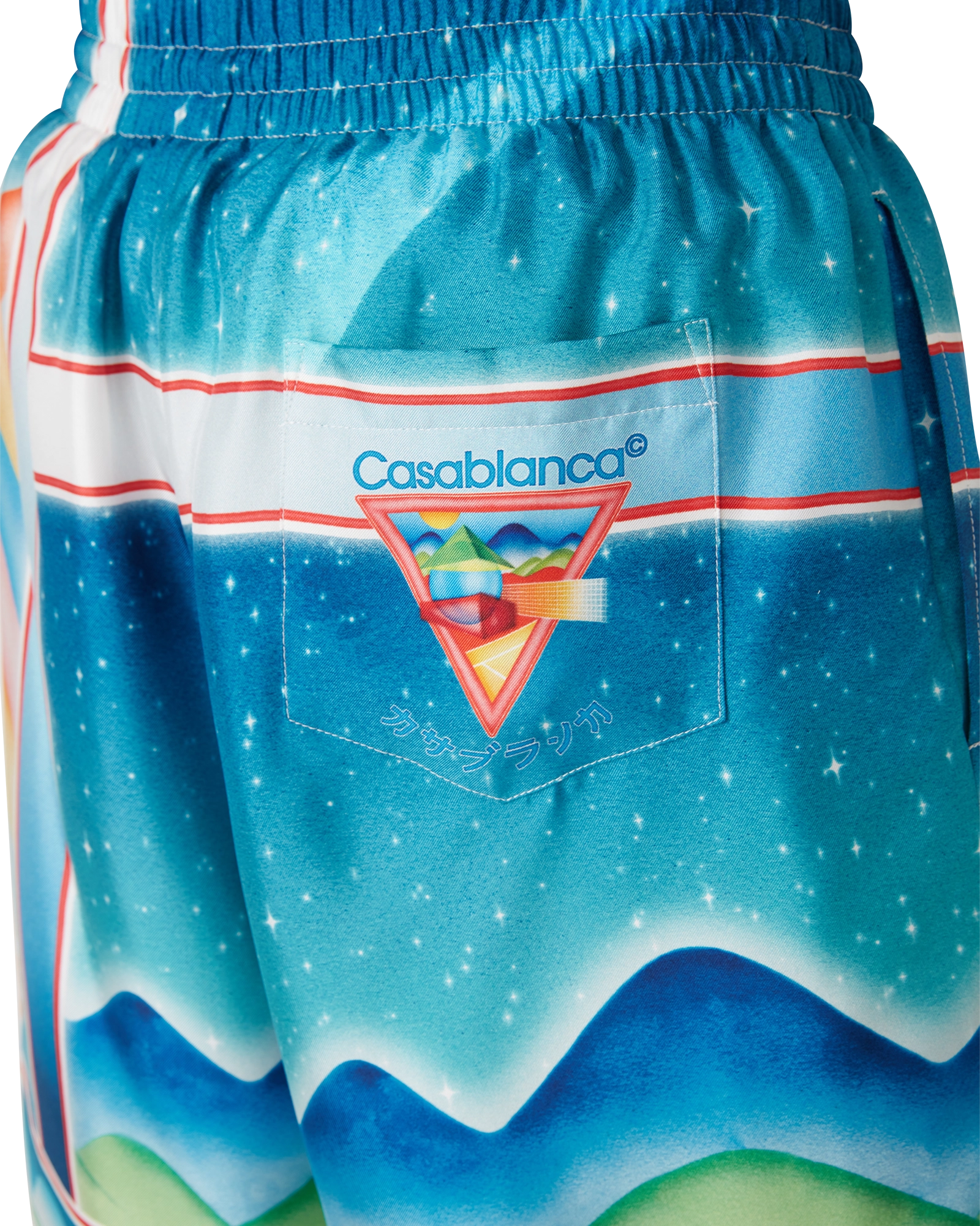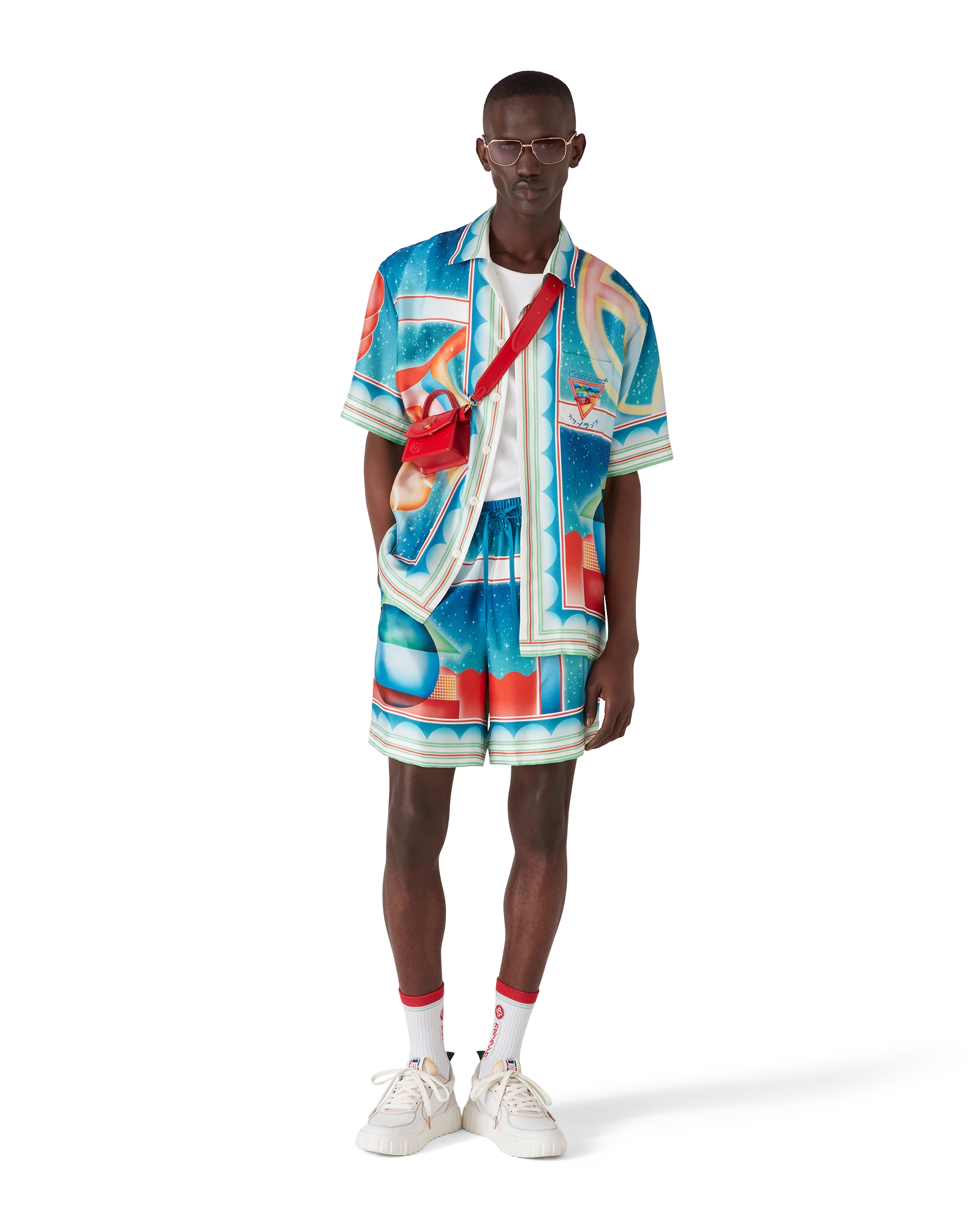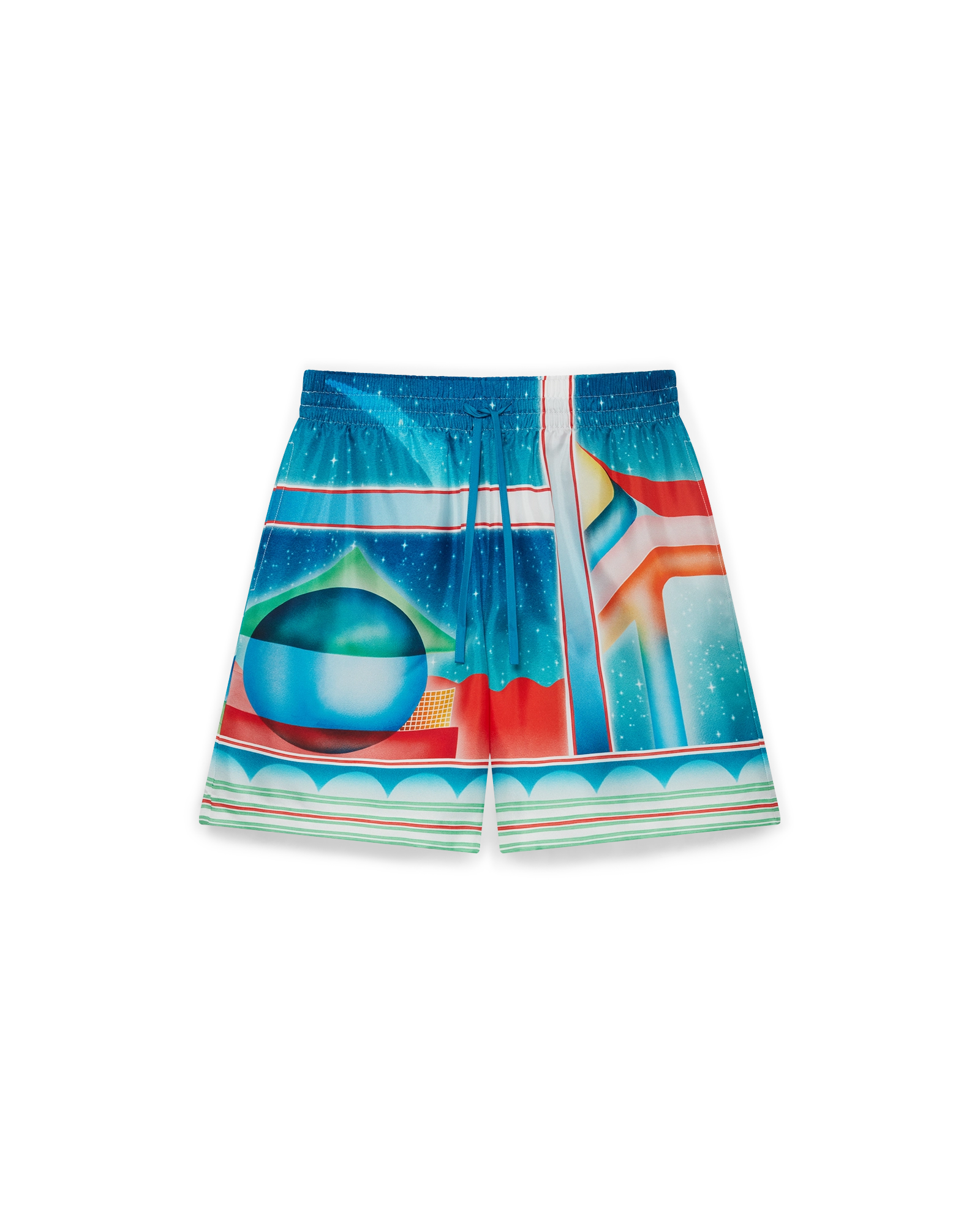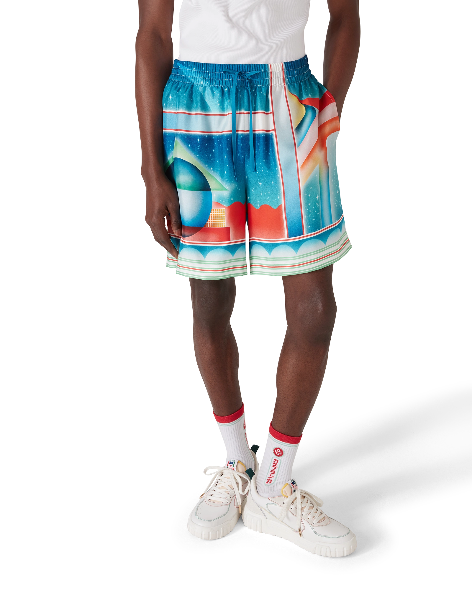 The Galaxy Court silk shorts are an all-over printed design crafted from silk twill fabric. Completed with an elasticated waistband, drawstring fastening, a lining, in-seam side pockets, and a back pocket.