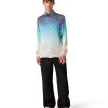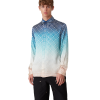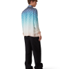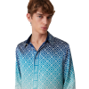 The jacquard gradient silk shirt is a long-sleeve all-over printed design crafted from a gradient monogram silk satin fabric. Completed with a collar, gold rim enamel buttons on the sleeves and collar, front button closure with interlocking CC branded corozo buttons, and Greek key inspired border detail on the collar, cuffs, placket and hem.