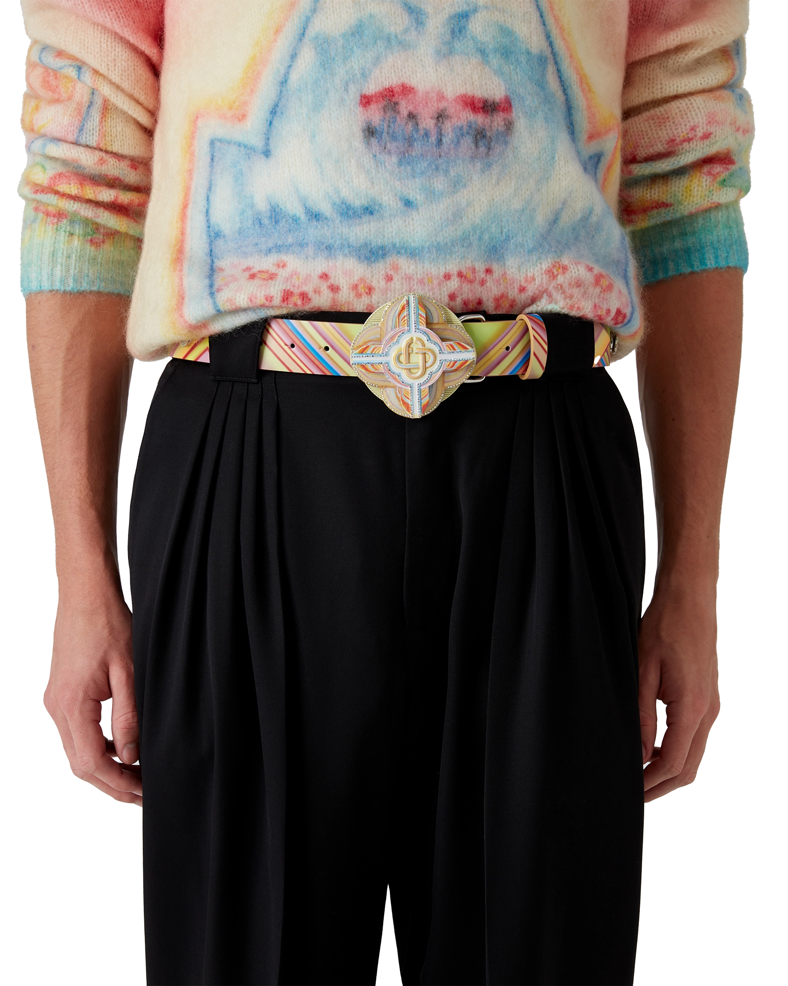 The Low Rider belt is a multicoloured design referencing the pop colours and airbrushing painting techniques used on low rider cars. Completed with the Casablanca logo along the length of the belt and on the buckle, a spinner disc, and crystals.