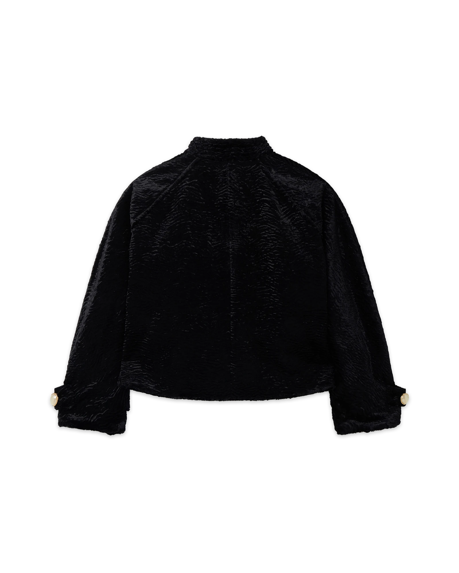 The Astrakhan Short Suit Jacket is a short style featuring the house’s signature gold-rimmed pearl button detailing. Crafted from an astrakhan fabric with a distinctive surface finishing high on the waist. Intended to be worn with the coordinating skirt.