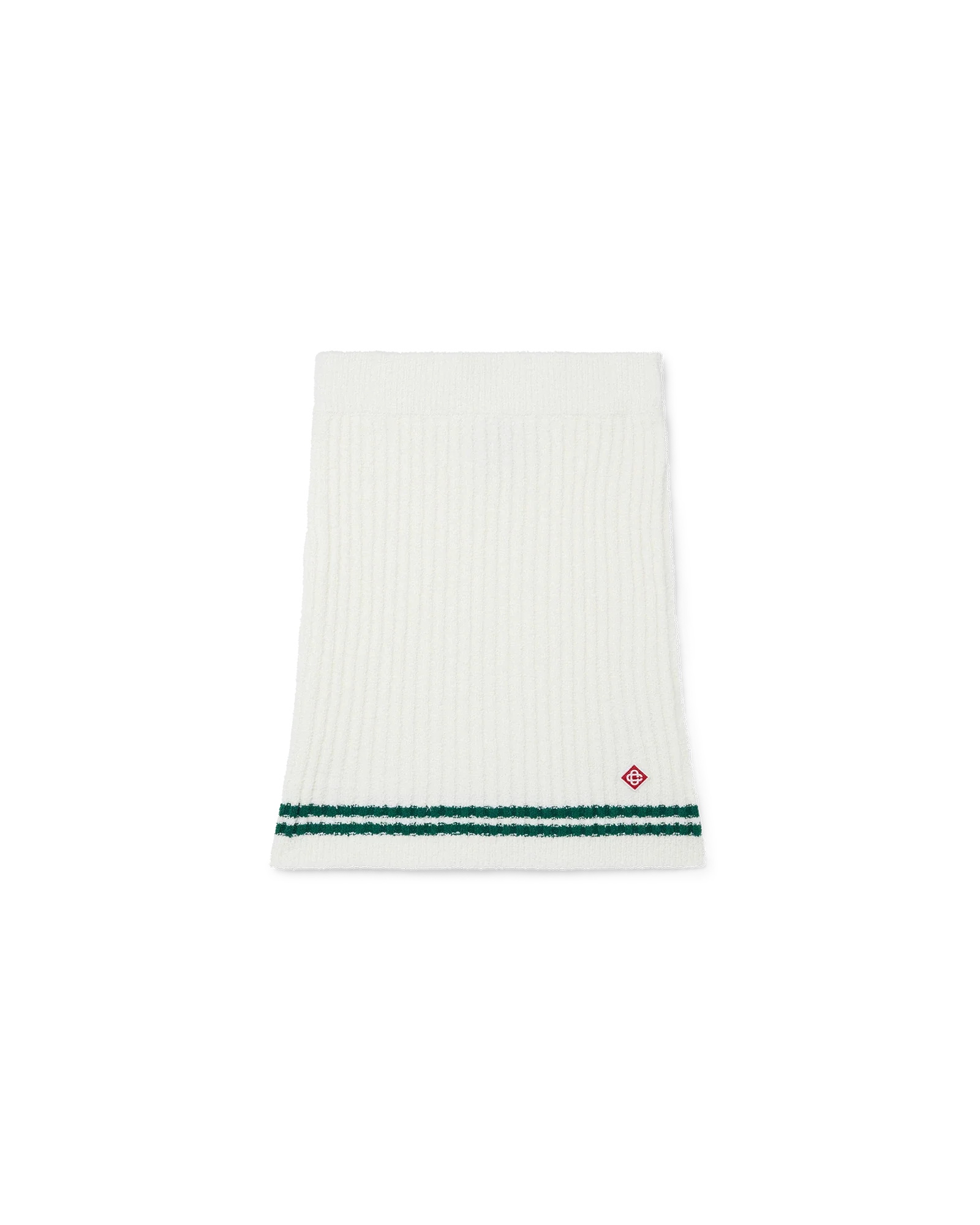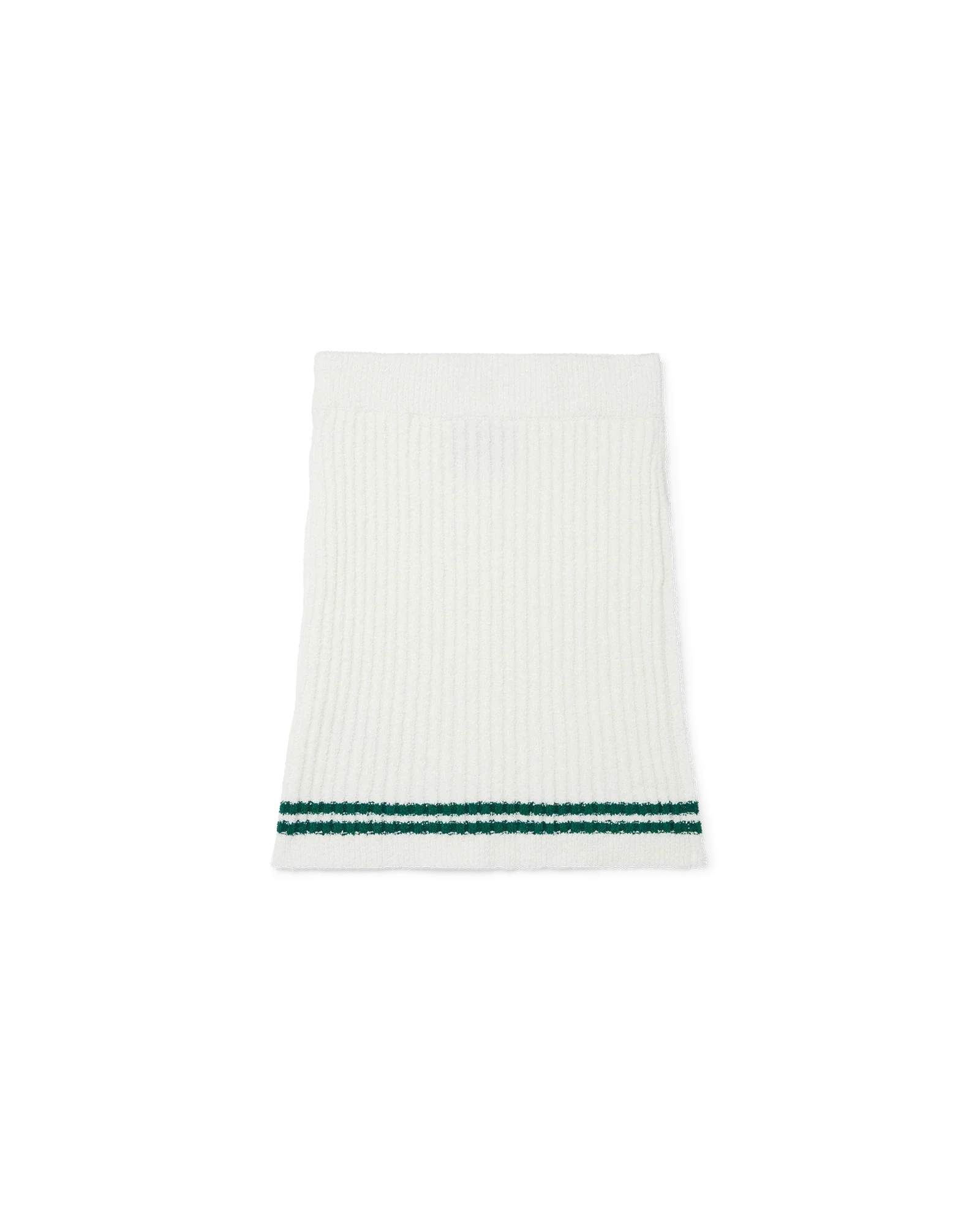 The white Boucle Knit Mini Skirt is a knitted style with a run of green strokes of colour across the hem. Completed with an elasticated waistband, the cotton and nylon mix knit is intended to sit at the waist and to be worn with a slim fit.