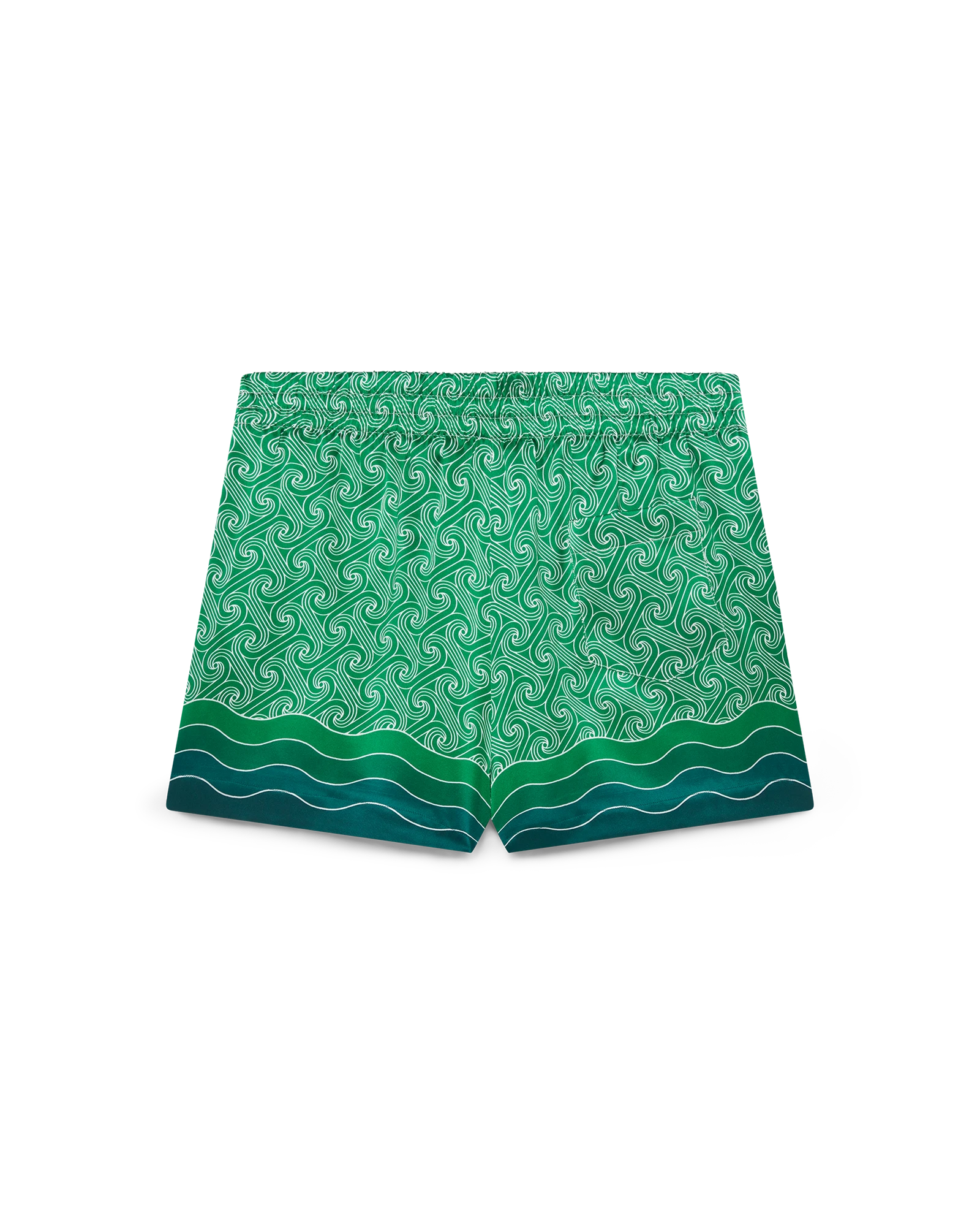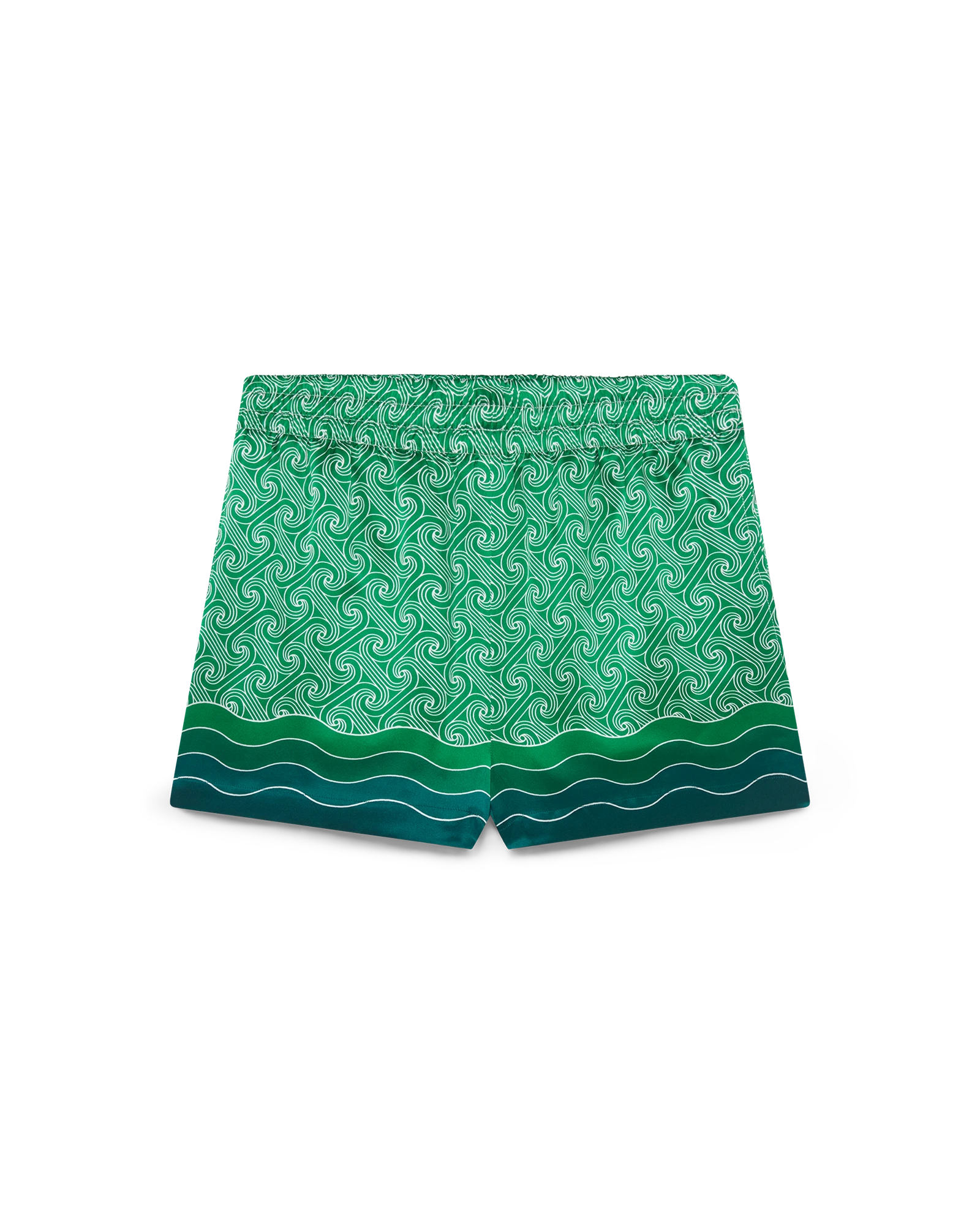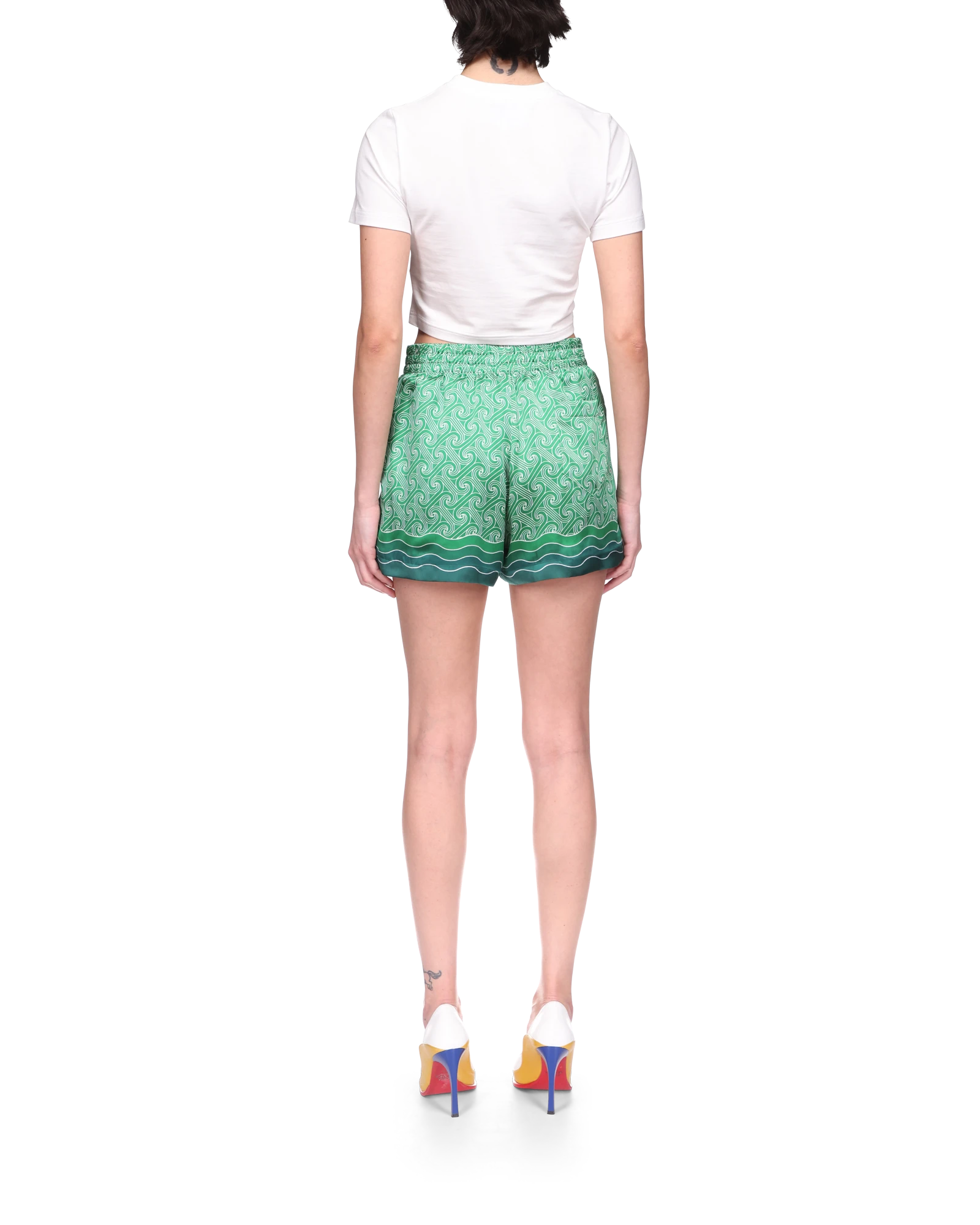 The column monogram silk shorts are an all-over printed design crafted from a silk satin fabric. Completed with an elasticated waistband with drawstring fastening, in-seam side pockets, a back pocket, a lining, and Memphis wave-inspired gradient hem detail.