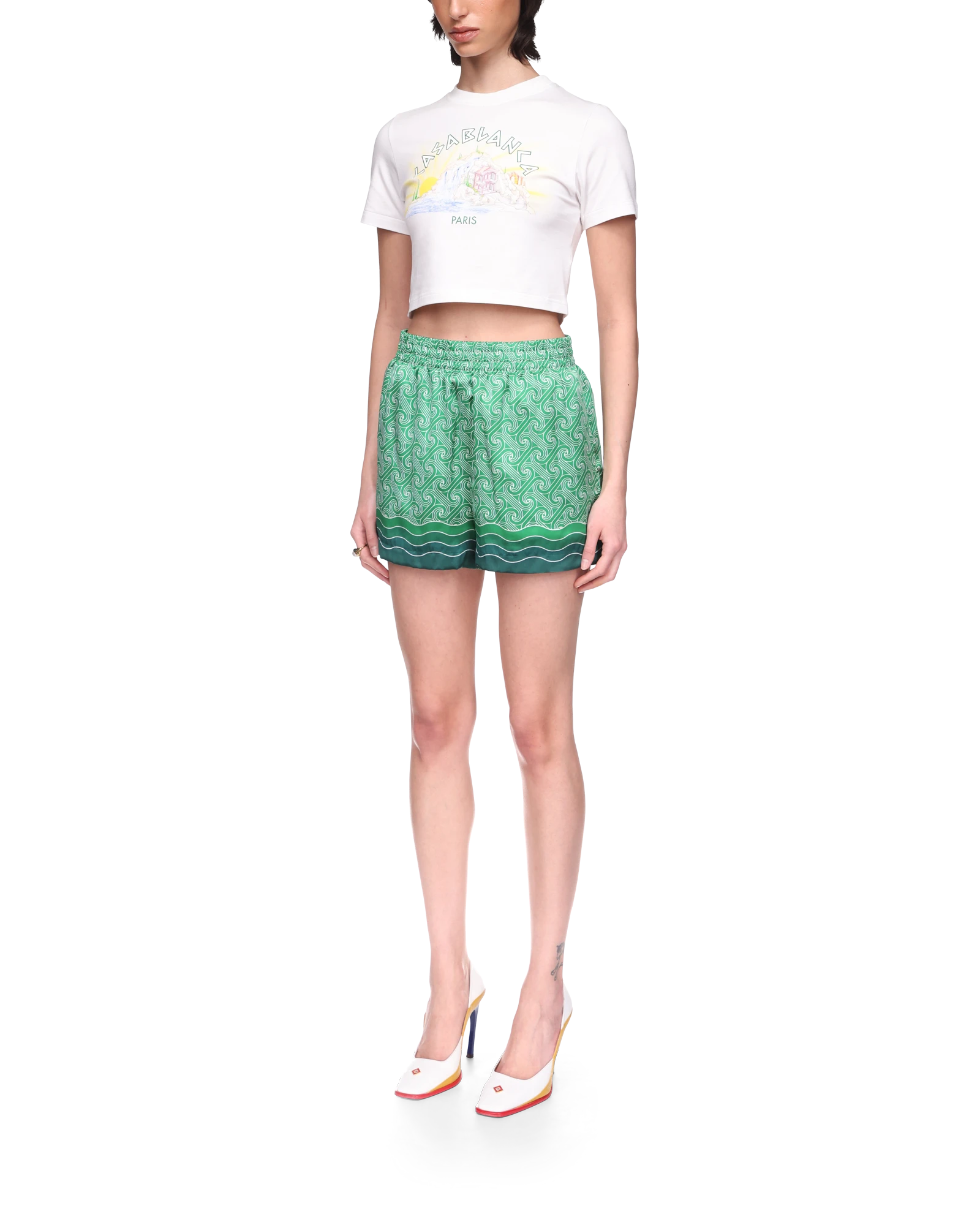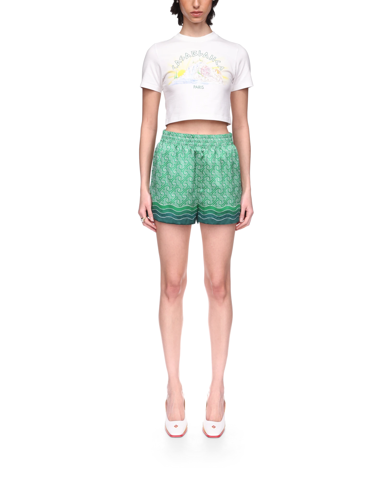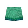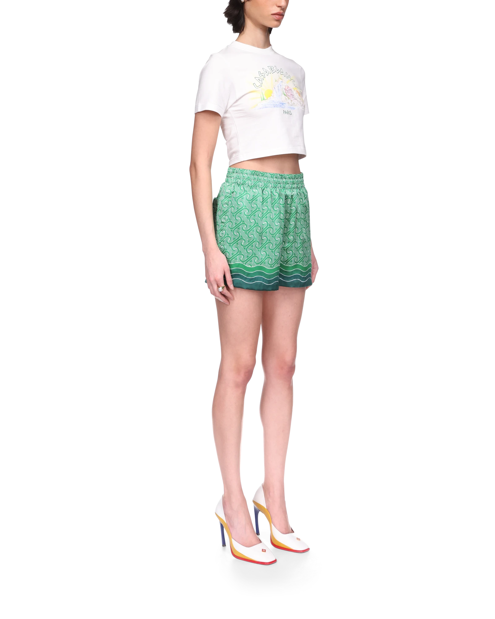 The column monogram silk shorts are an all-over printed design crafted from a silk satin fabric. Completed with an elasticated waistband with drawstring fastening, in-seam side pockets, a back pocket, a lining, and Memphis wave-inspired gradient hem detail.