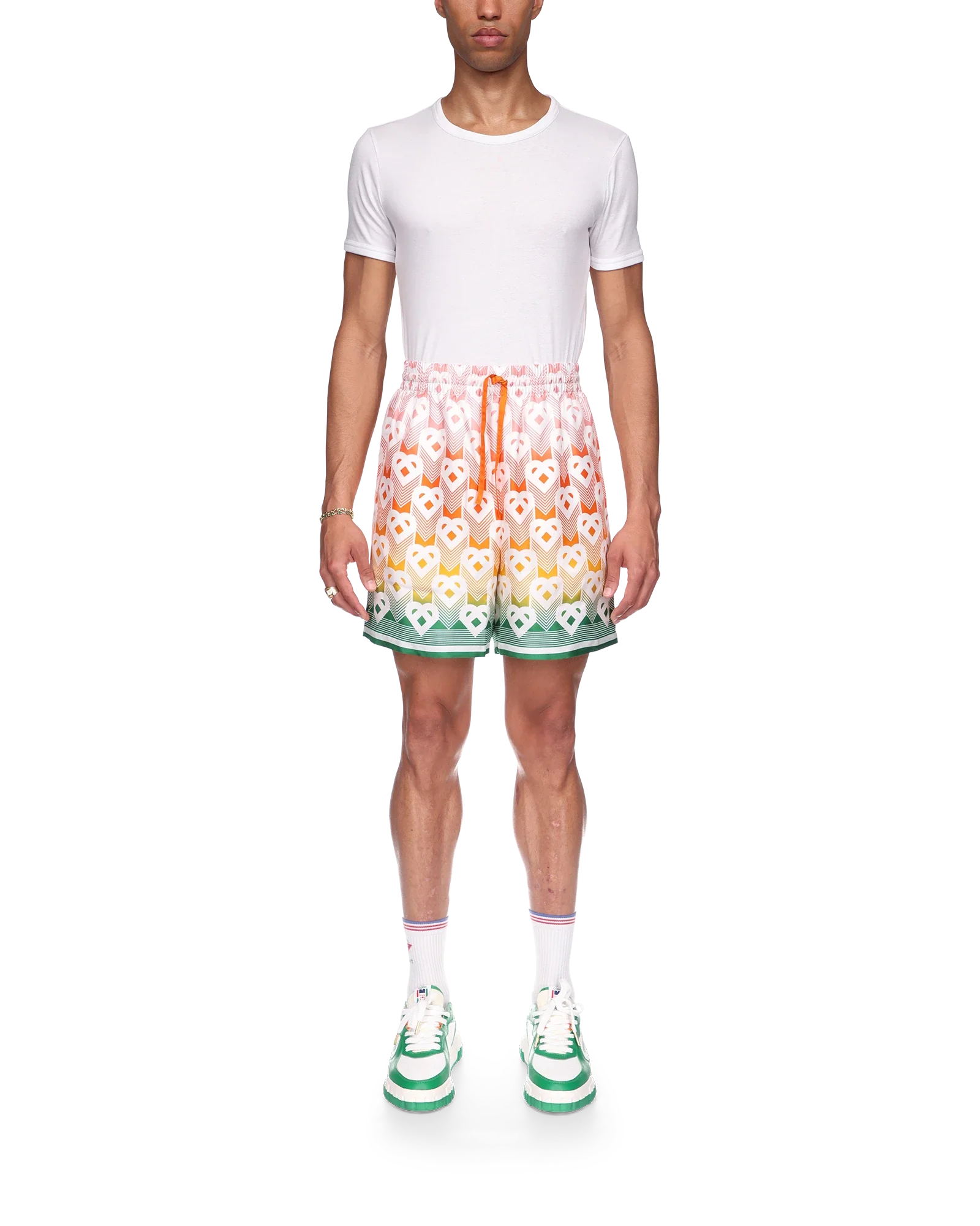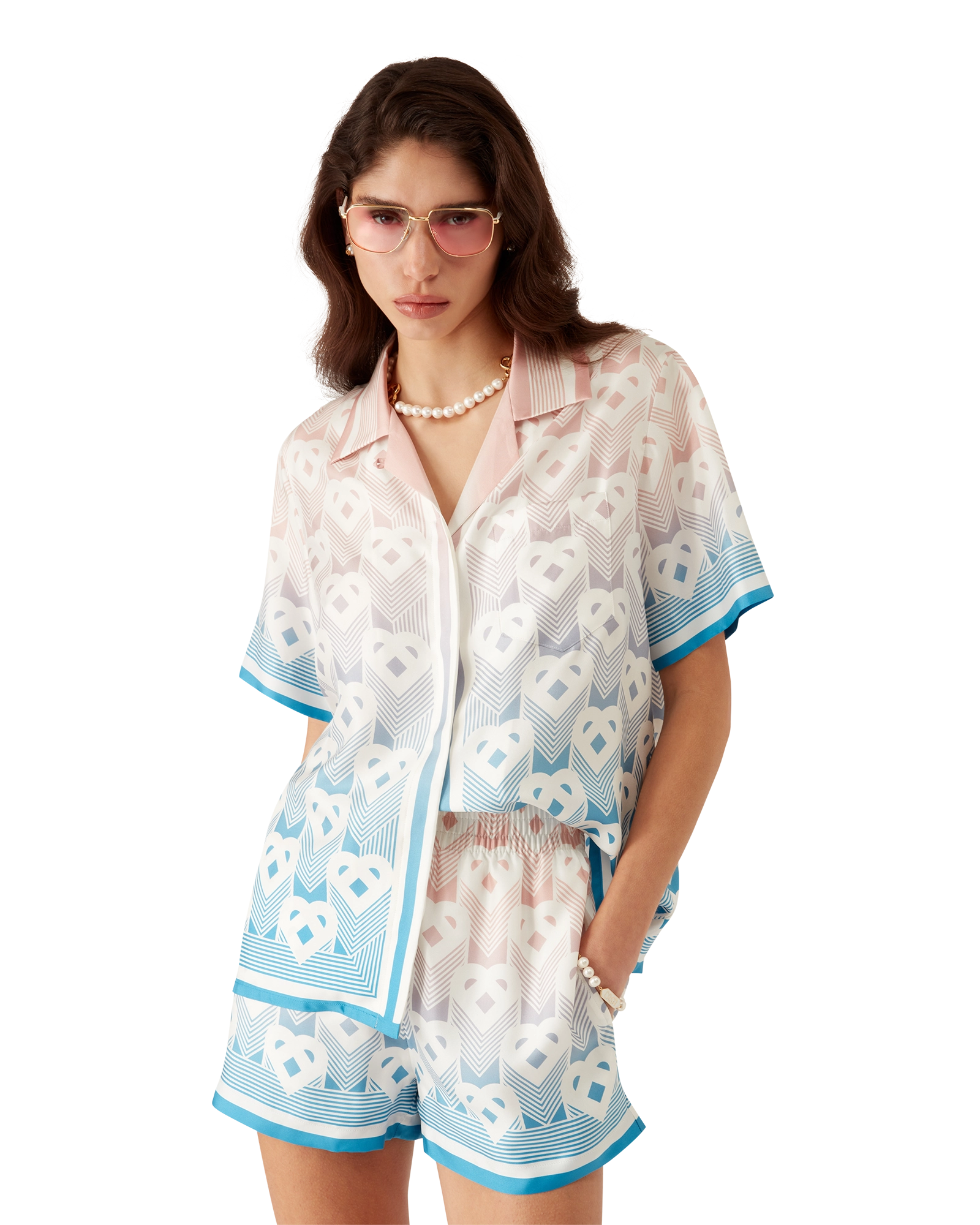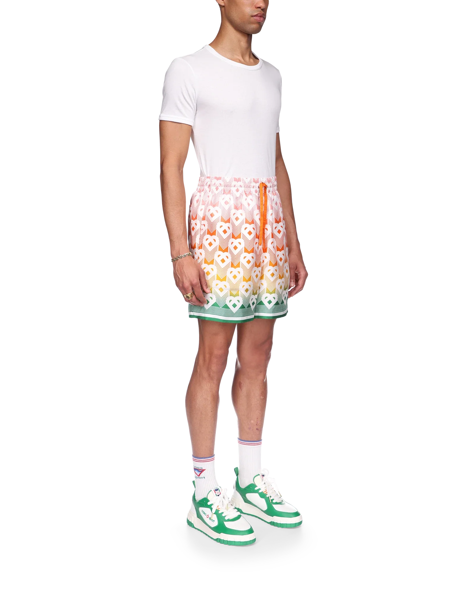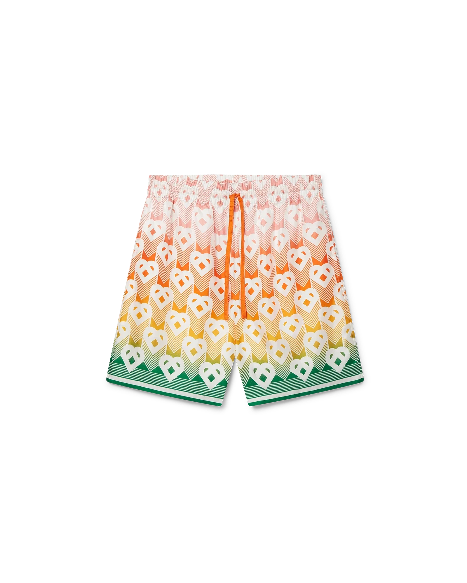 The Gradient Heart Monogram silk shorts are an all-over print design featuring the house’s heart monogram on this season’s gradient background representative of the rich exchanges across cultural disciplines in African art, music and film. Crafted from a monogrammed silk twill fabric and finished with an elasticated waistband, drawstring fastening, side pockets, and striped hem detail.