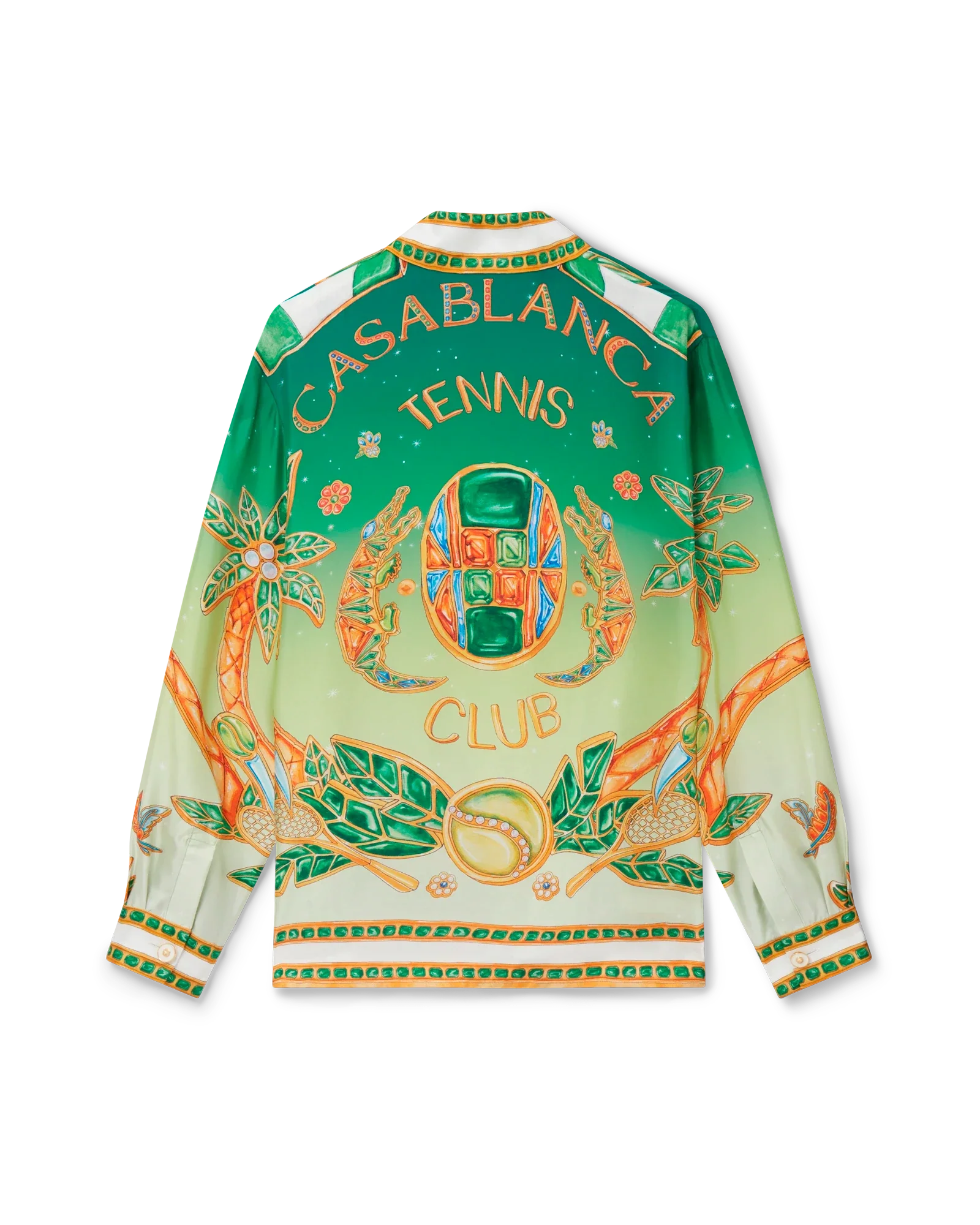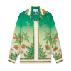 The Joyaux D’Afrique silk shirt is a long-sleeve all-over printed style featuring seasonal artwork incorporating nature references from Nigeria and the house’s jewellery designs blended with our traditional tennis club layout. Crafted from a silk twill fabric with a cuban collar, button closure, and gold rim enamel buttons.