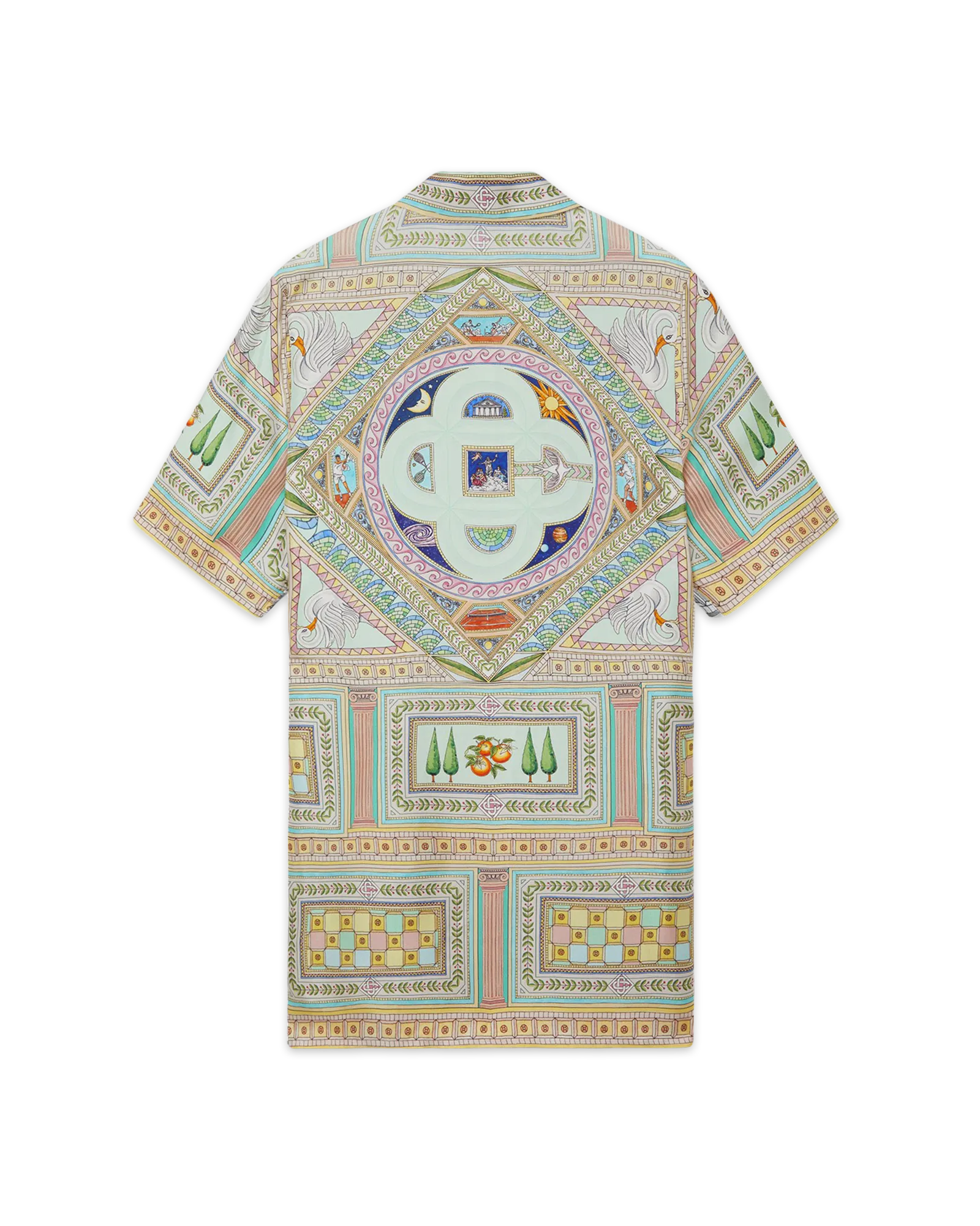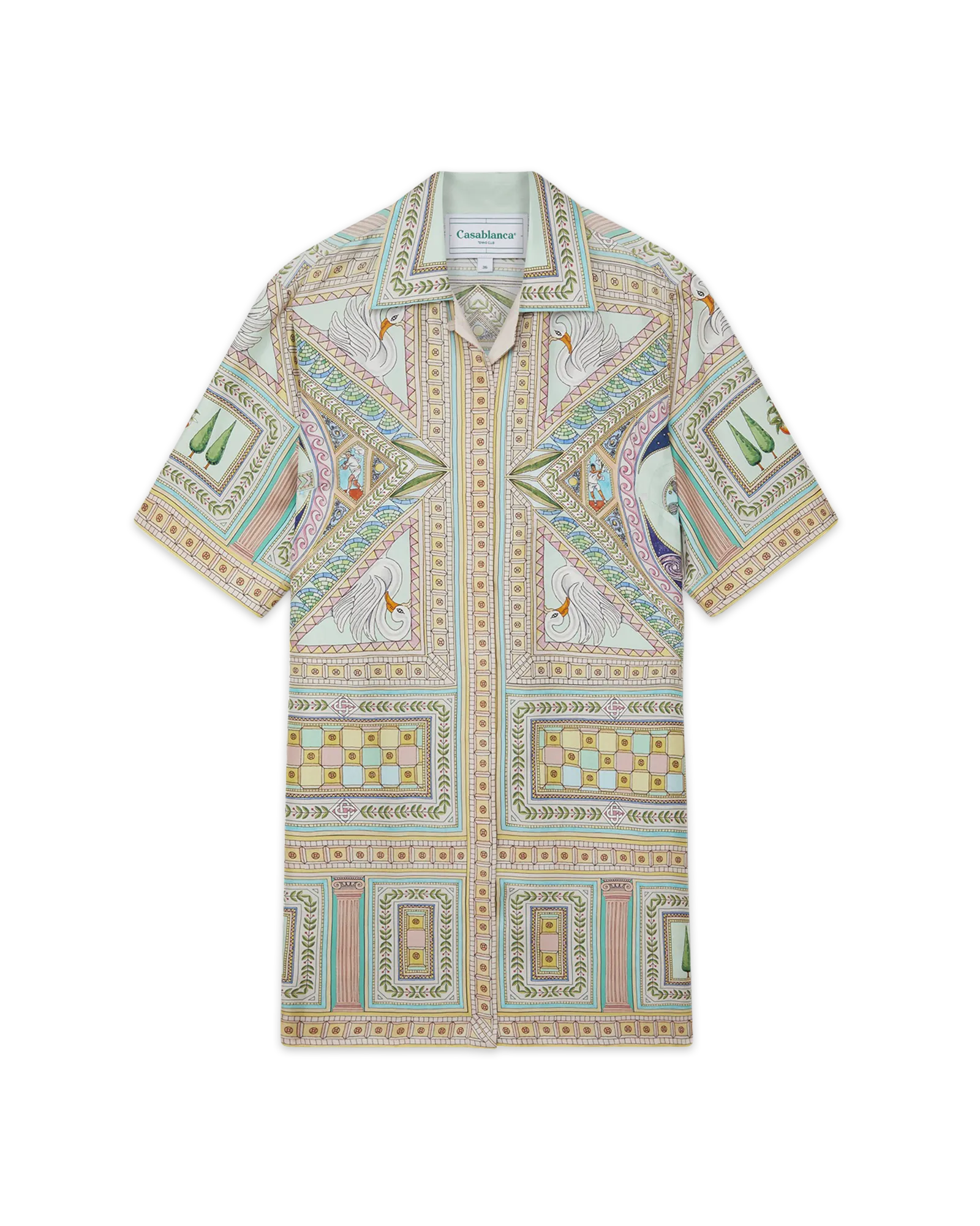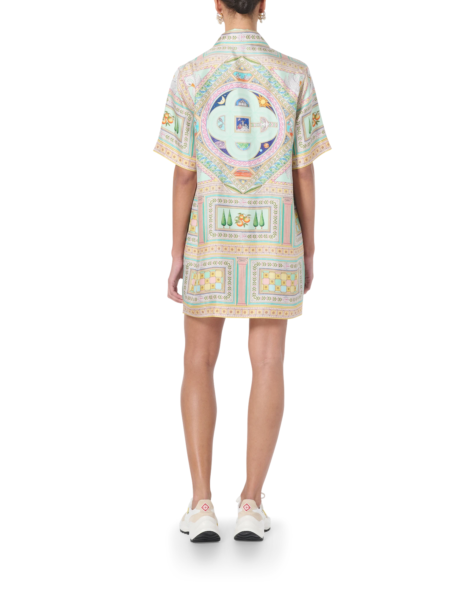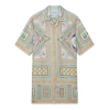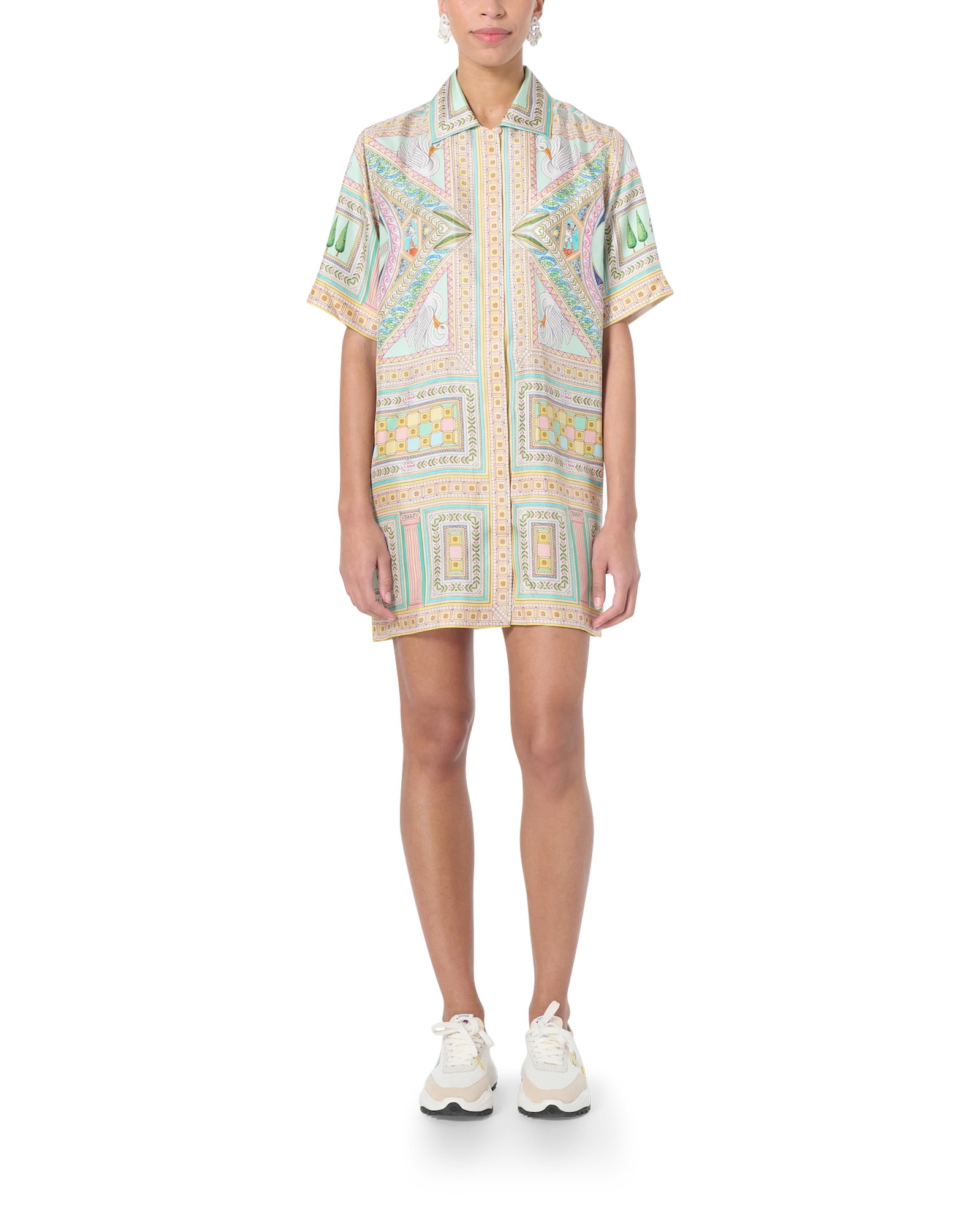 The Le Labyrinthe short-sleeve printed silk shift dress features Casablanca symbology with Arabic iconography and our signature diamond monogram in seasonal tones. Finished with a collar, and front button closure and designed for a classic fit.
