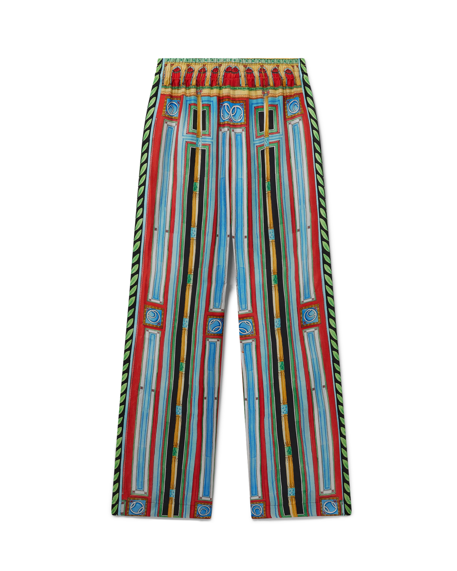 The Le Palais en Fleur silk trousers are an all-over printed design featuring seasonal artwork inspired by Pompeii’s architectural history, its vibrant colours, and symmetry, crafted from a silk twill fabric. Completed with a polyester lining, in-seam pockets, and signature Laurel leaf artwork down the sides.