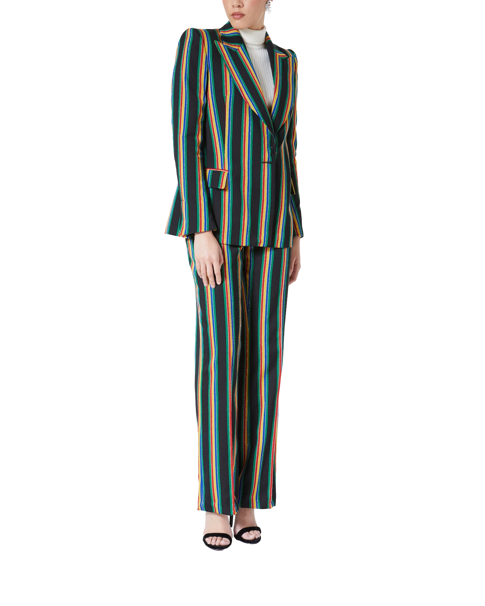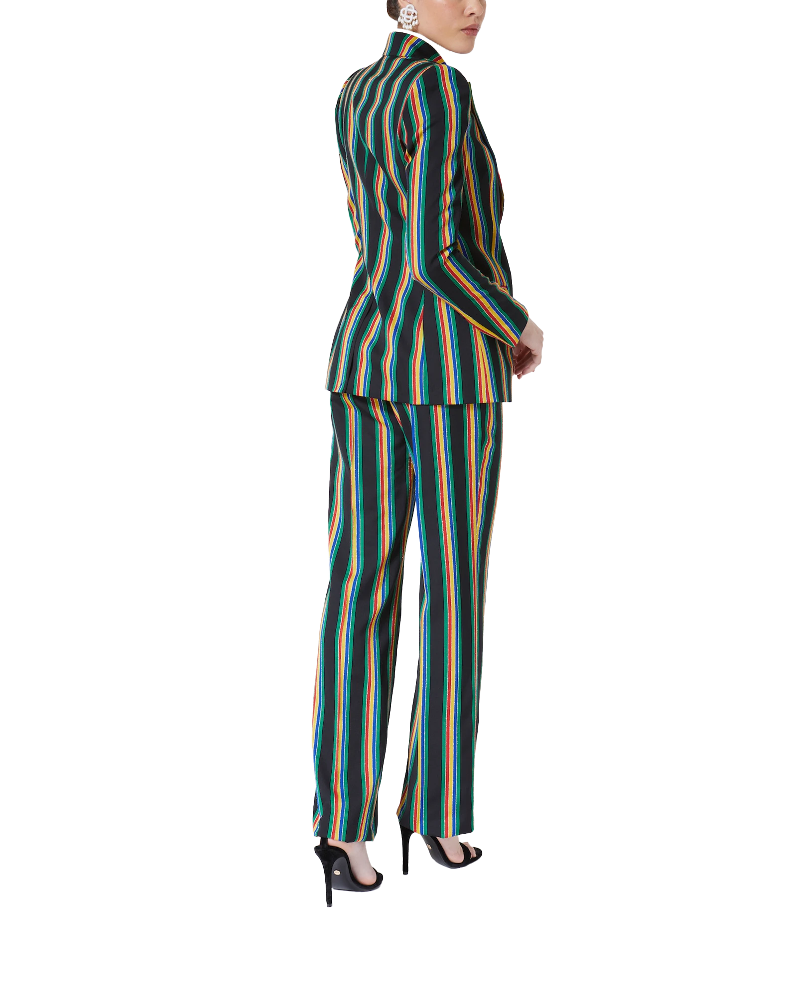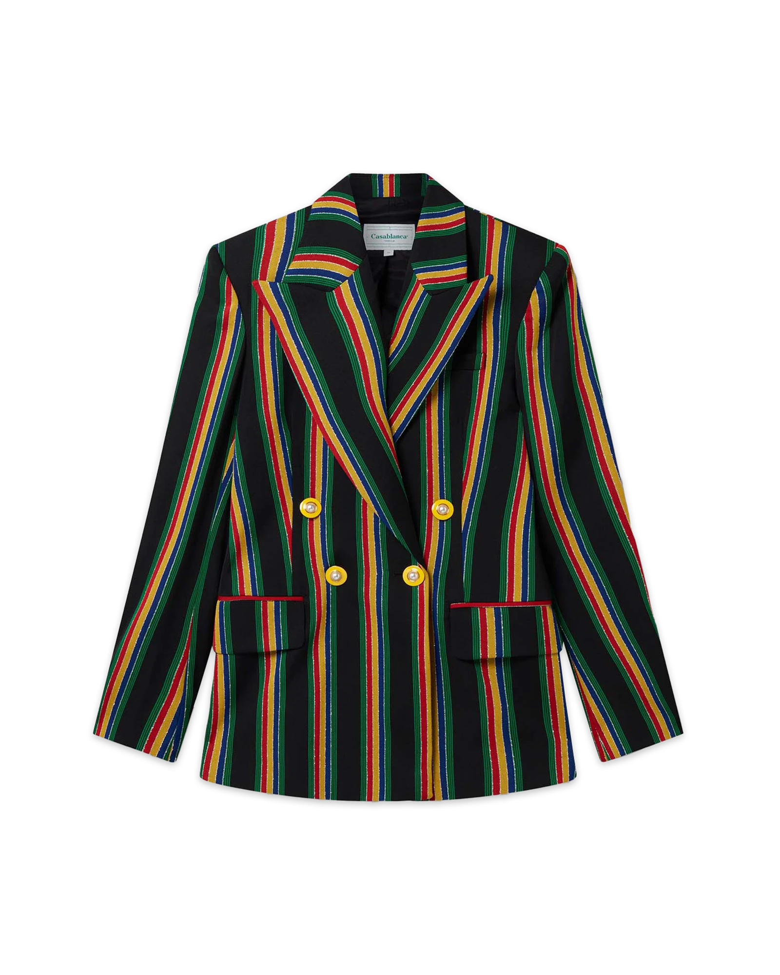 The Medallion Suit Breasted Jacket is a classic double-breasted tailored jacket featuring an all-over lurex stripe design. Completed with a front lapel, double button and cuff fastening. Intended to be worn with its coordinating trousers.