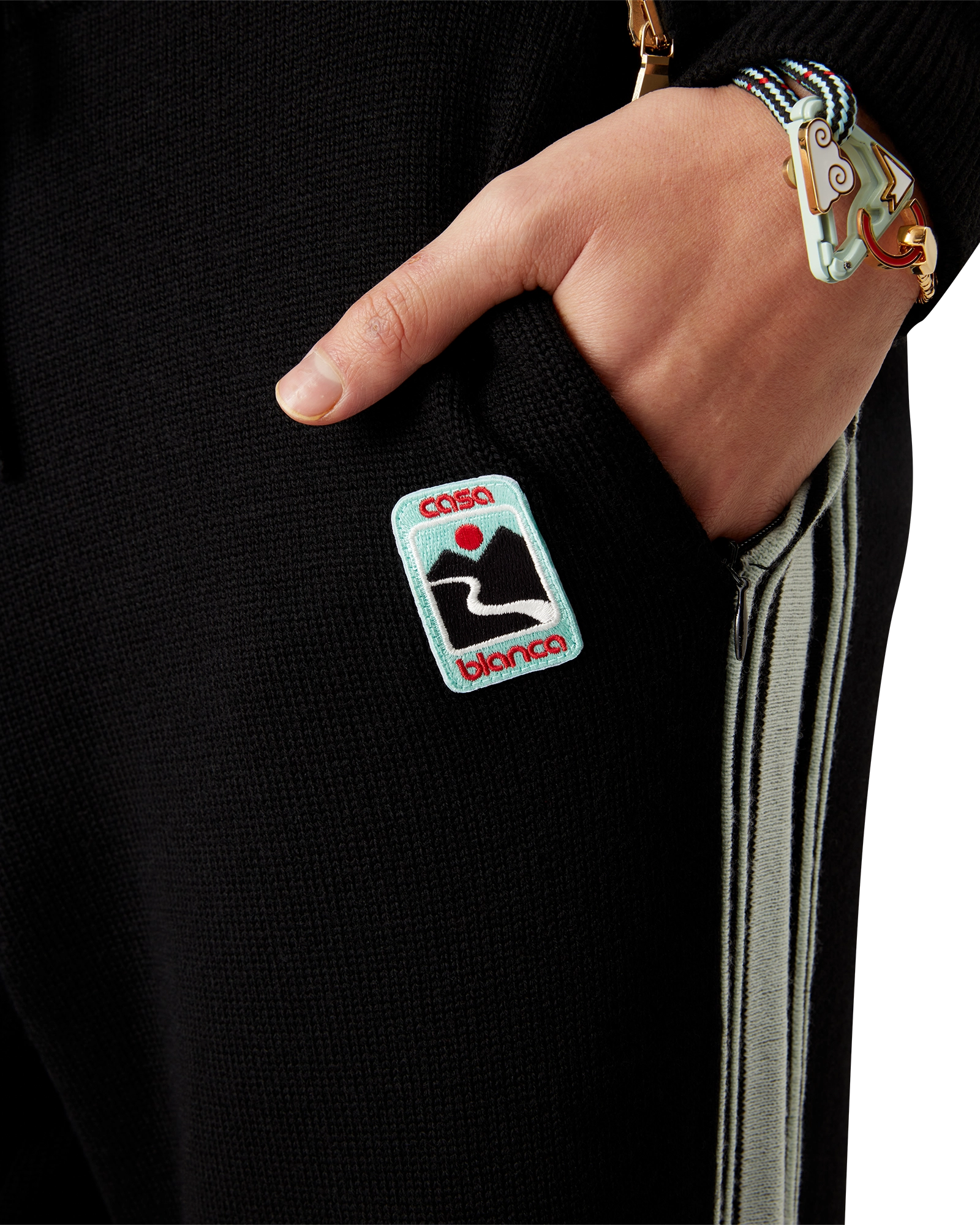The merino knit track pants is a straight-leg knitted design crafted from merino wool fabric. Completed with an elasticised waistband, drawstring fastening, in-seam pockets, a back patch pocket, stripe details down the sides, and the Casablanca logo.
