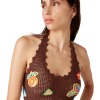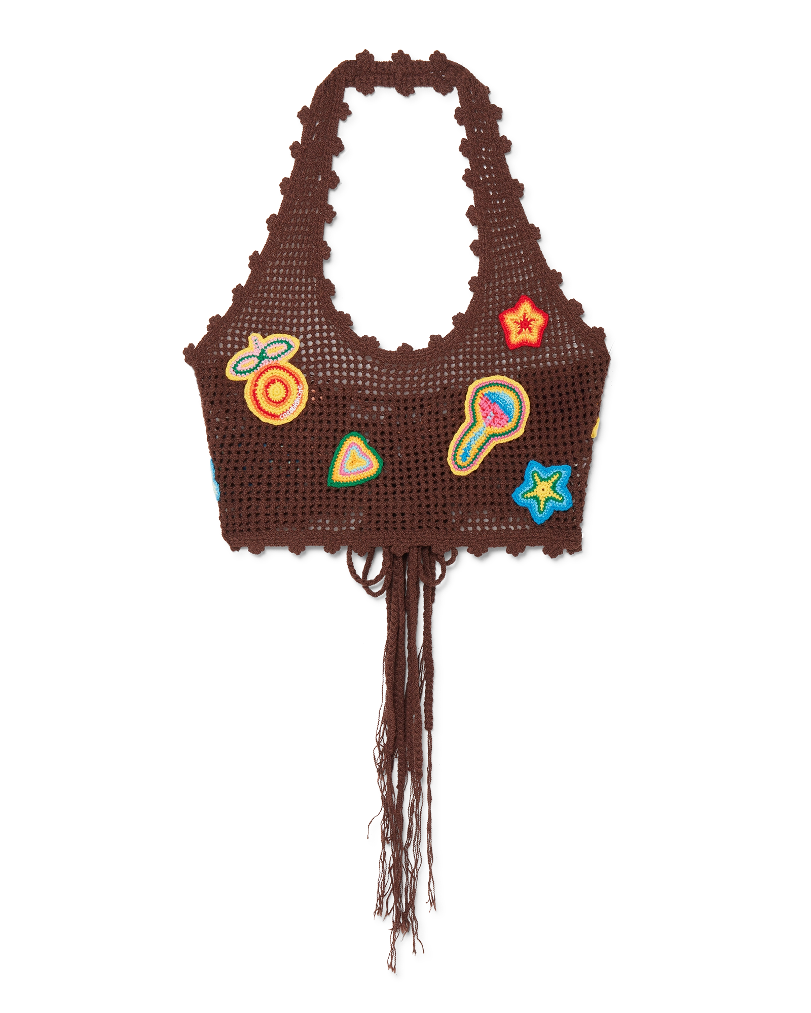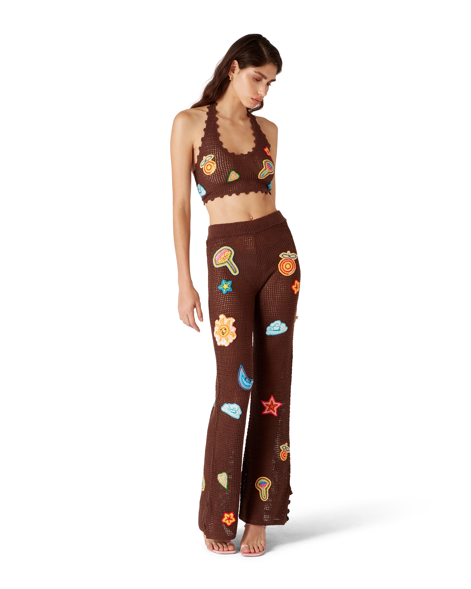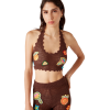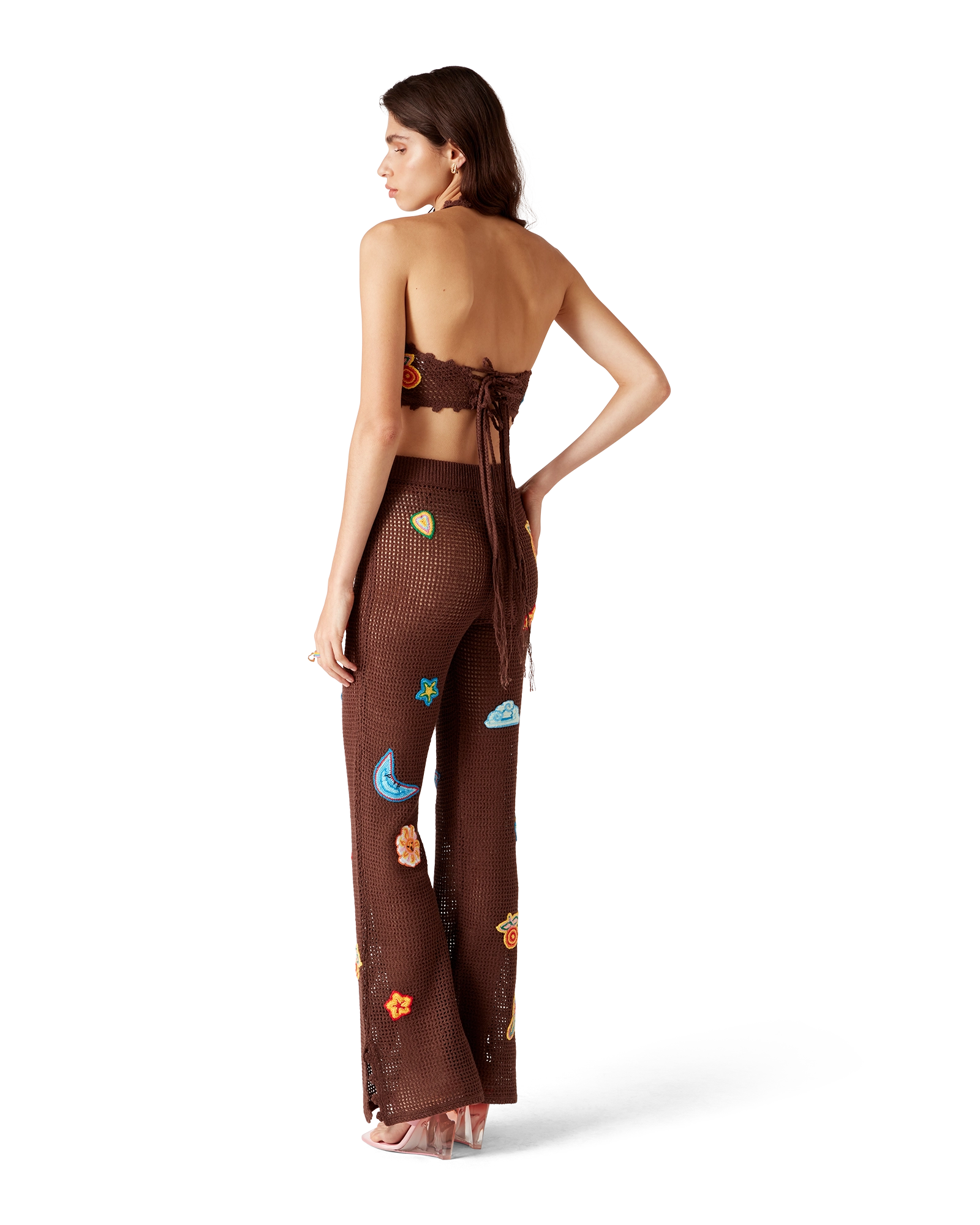 The motif crochet crop top is a halter neck design crafted from an open-weave crochet cotton fabric. Completed with motifs of the house’s classic design elements, and string fastening at the back. This piece is intended to be worn with its coordinating motif crochet trousers.
