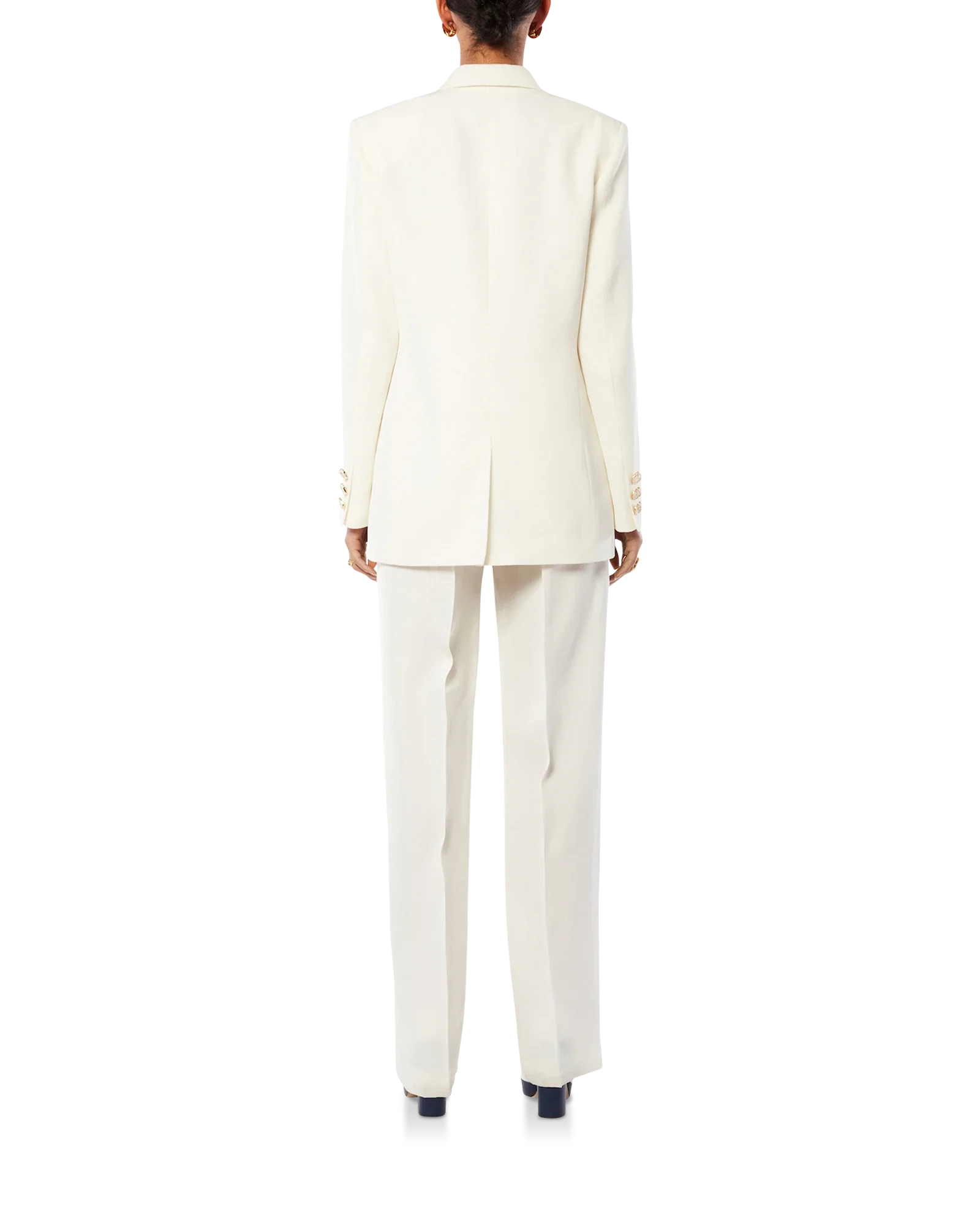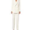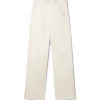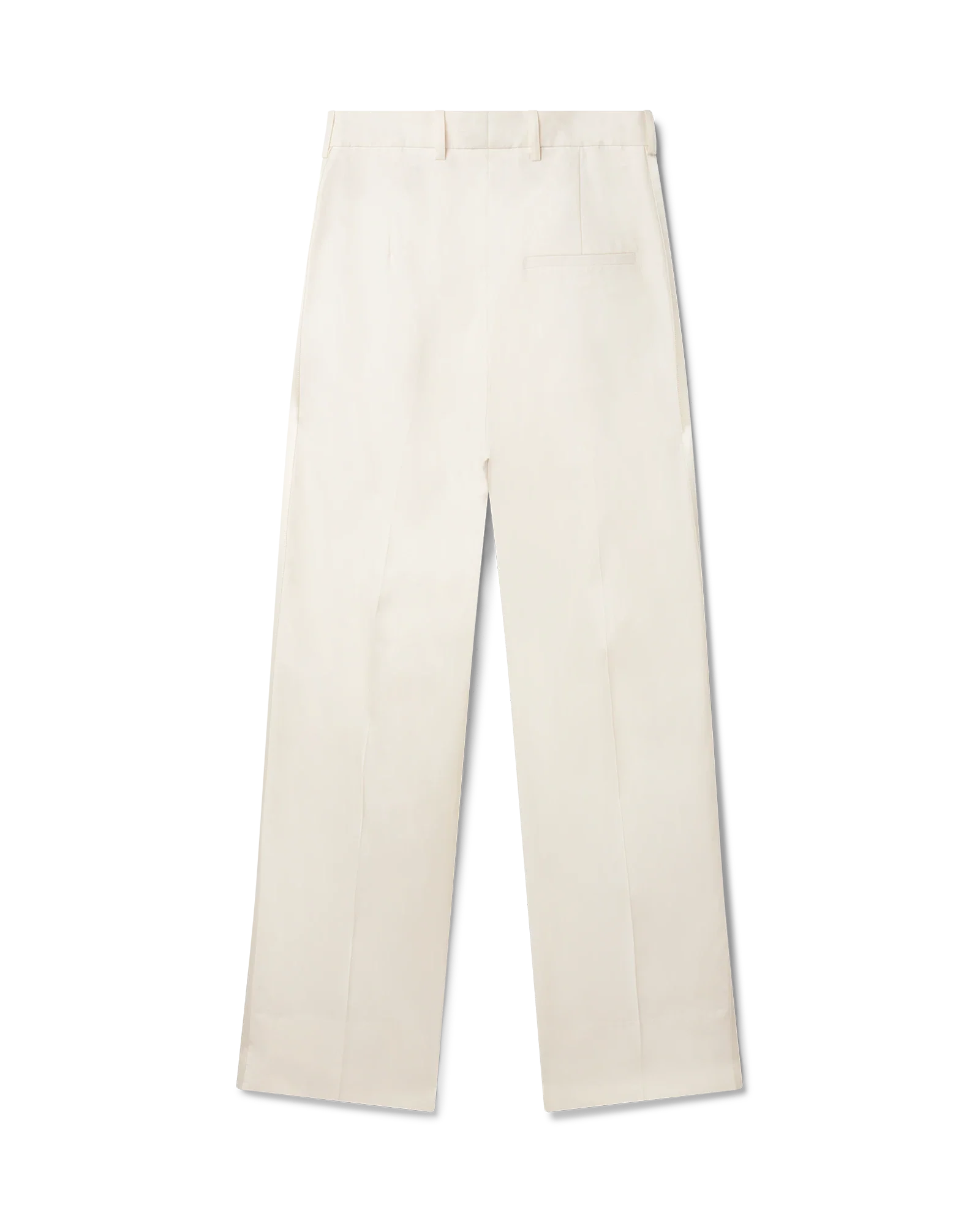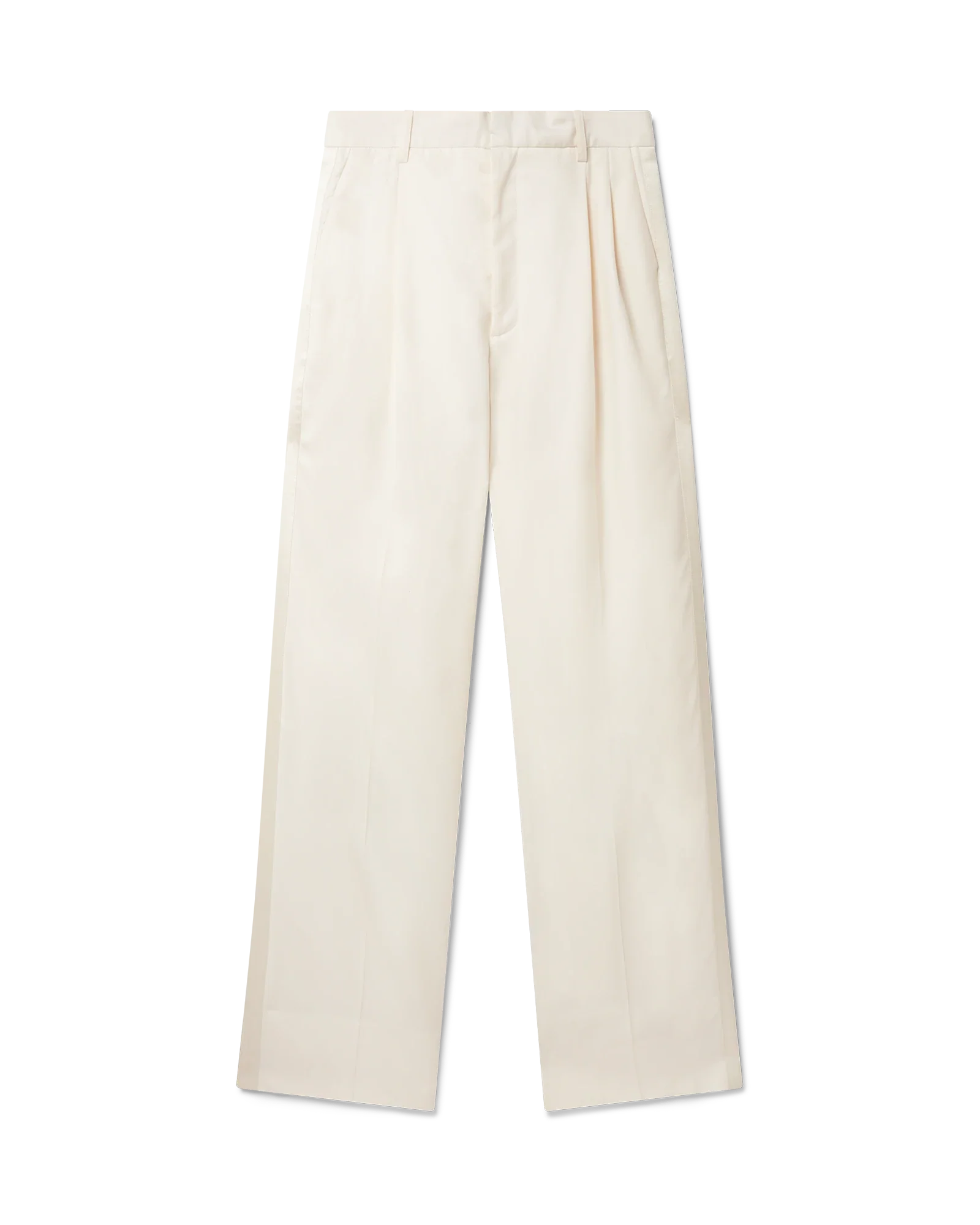 The off-white wide-leg trousers are a classic pleated front design with a familiar silhouette. Crafted from a silk blend fabric and featuring slanted pockets, and a back pocket.