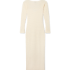 The textured knitted dress is a long-sleeve maxi style crafted from cotton blend fabric. Completed with a boat neckline, slitted sleeves, and hem to thigh slit.